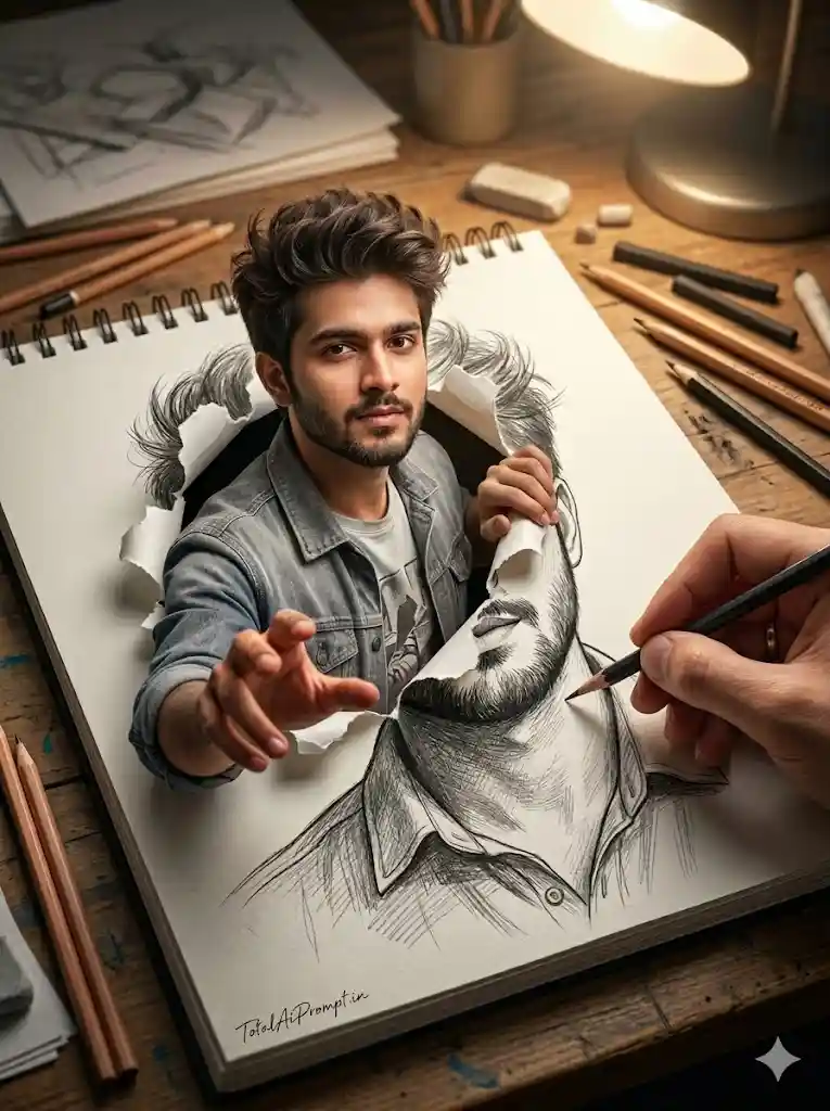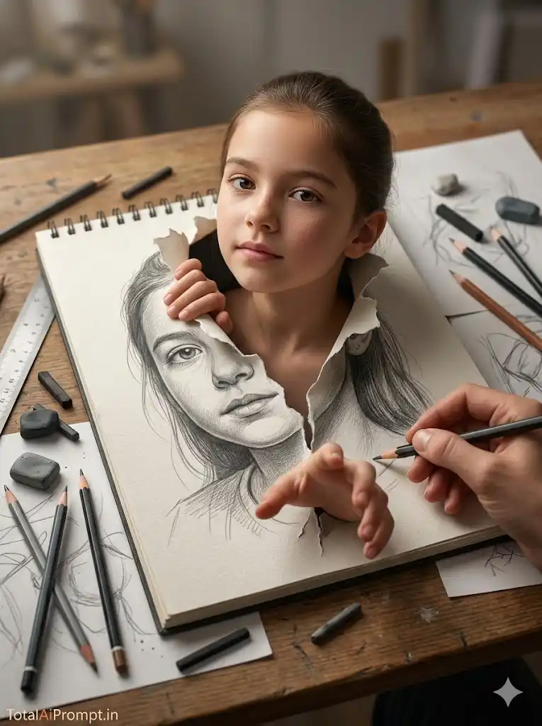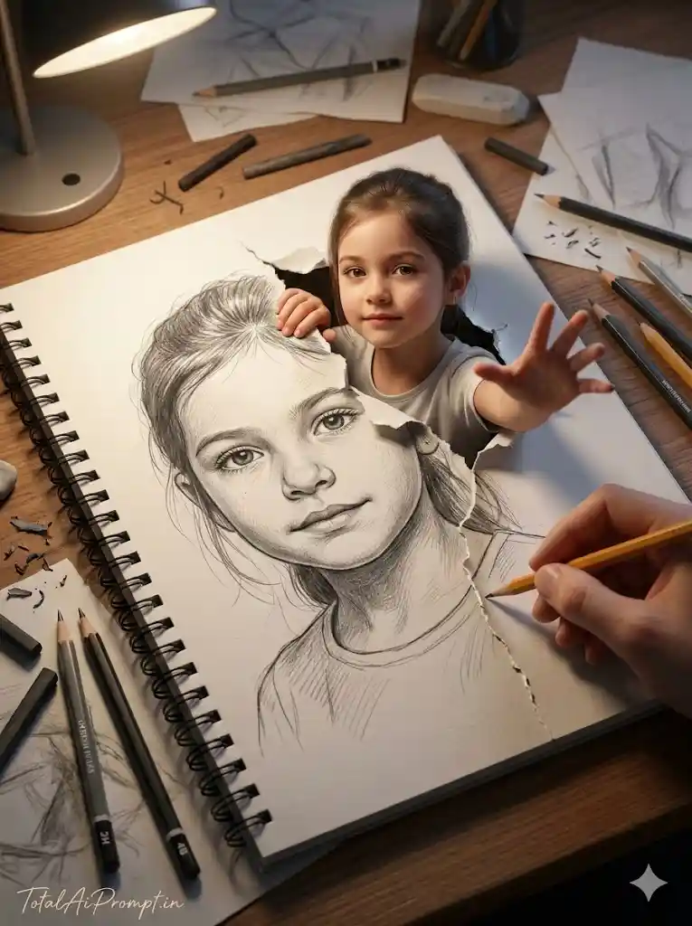 Create an ultra-realistic, cinematic 3D portrait of a young girl whose face matches the reference image exactly, with zero alterations—no reshaping, beautification, or smoothing filters. Preserve natural skin pores, hair strands, eyelashes, and original facial structure in crystal-clear Ultra HD detail. The scene features a large open spiral-bound sketchbook on a wooden art desk, with a highly detailed graphite pencil sketch of the girl on the page. The paper appears torn from the center as if reality is breaking through the drawing, with the girl’s upper body emerging: one hand gripping the ripped paper edge and the other reaching outward toward the viewer, head slightly tilted with a confident expression. The desk is realistically detailed with graphite pencils, charcoal sticks, eraser shavings, and loose sketch papers, while a human hand holding a yellow pencil hovers near the drawing as if completing it. Warm desk lamp lighting illuminates the sketchbook, complemented by subtle rim light outlining the girl and soft shadows along the torn edges. Capture the composition from an 85mm cinematic portrait perspective, with ultra-sharp focus on the face and torn paper textures, while the background remains softly blurred for depth. Render in a hyper-realistic 3D illustration style combined with photorealistic portrait quality, 8K ultra-detailed, giving the impression of a sketch transforming into a real human figure. Use a 3:4 vertical aspect ratio. Include negative prompts: cartoon style, anime, plastic skin, CGI artifacts, blur, low resolution, distorted anatomy, watermark, logo. Add the text/signature “TotalAiPrompt.in” at the bottom-left corner in a small, thin, handwritten cursive font, white or soft off-white, exuding subtle premium elegance.