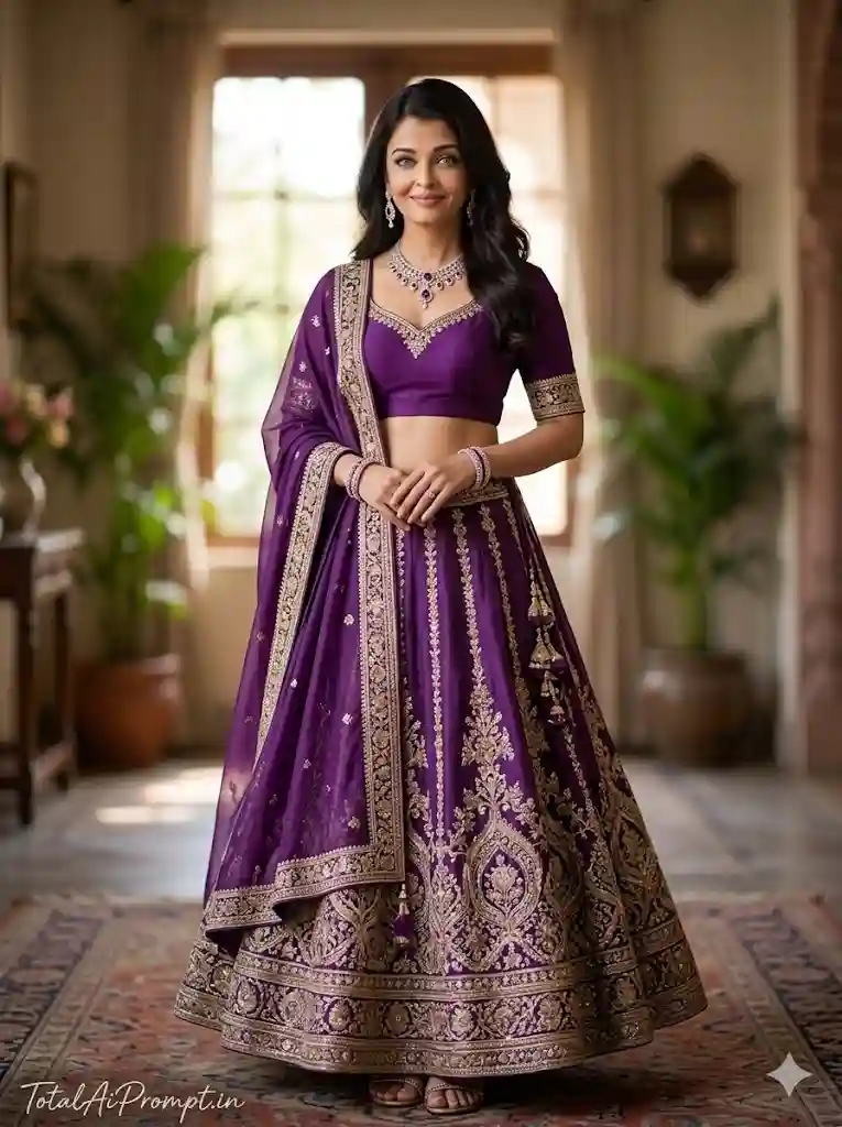 Create a vertical 3:4, ultra-realistic, cinematic full-body portrait using the first uploaded image as the primary reference, ensuring the face is preserved exactly as it is with absolute precision—no face swap, no morphing, no beautification, and no changes to facial structure, skin tone, features, expression, or makeup—enforcing strict identity lock with full reference priority; seamlessly dress the subject in the provided purple lehenga, accurately adapting the outfit to the body with natural fit, realistic fabric draping, detailed embroidery, and authentic textures, ensuring the attire appears genuinely worn and proportionate in a full-body composition; maintain lifelike skin detail, natural posture, and balanced proportions, with elegant styling and refined presentation; place the subject in a visually appealing, softly lit environment that complements the outfit, using warm, cinematic lighting to enhance depth, fabric richness, and overall realism without artificial exaggeration; ensure all elements—lighting, skin, clothing, and background—appear completely natural and high-resolution; include the text “TotalAiPrompt.in” at the bottom-left corner in a small, thin, handwritten cursive font with subtle premium elegance in white or soft off-white color; negative prompts and restrictions: no facial distortion, no identity deviation, no asymmetry, no blur, no over-sharpening, no unrealistic skin smoothing, no color banding, no lighting inconsistency, no extra limbs or artifacts, no exaggerated proportions, no duplicate faces, no cartoonish or CGI effects, and no additional text, watermark, or logo beyond the specified signature.