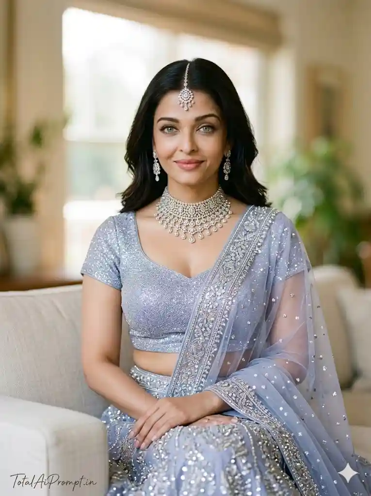 Create a vertical 3:4, ultra-realistic, cinematic-quality image by using Image 2 strictly as the person reference (preserving the face, body, skin tone, pose, hairstyle, and expression exactly as they are with zero modification, enforcing full identity lock and absolute reference priority) and Image 1 strictly as the clothing and jewelry reference; seamlessly transfer and apply the outfit from Image 1 onto the subject in Image 2, ensuring a near 1:1 match in every detail including a lavender/icy blue heavily embroidered Indian lehenga choli with intricate sequin work and reflective silver detailing, a short-sleeve glitter-textured blouse, and a matching dupatta draped naturally over the shoulder with identical transparency, fabric behavior, and sparkle; include the exact same jewelry set from Image 1 such as a diamond choker necklace with layered stones, matching diamond earrings, and a centered maang tikka, maintaining a glossy, premium bridal aesthetic; ensure the outfit integration looks completely natural with realistic fabric folds, accurate embroidery depth, correct reflections, and proper body fitting without distortion; apply soft cinematic lighting with balanced highlights and shadows to enhance realism, texture, and depth, achieving a high-resolution, professional fashion photography look where skin, fabric, and lighting appear lifelike and consistent; add the text “TotalAiPrompt.in” at the bottom-left corner in a small, thin, handwritten cursive font with subtle premium elegance in white or soft off-white color; negative prompts and restrictions: no face alteration, no identity change, no pose or expression change, no hairstyle modification, no color mismatch, no incorrect outfit design, no extra or missing jewelry, no distortion in embroidery or fabric, no blur, no low quality, no cartoon/anime/illustration/CGI style, no unrealistic lighting, no extra limbs or artifacts, and no additional text, watermark, or logo beyond the specified signature.