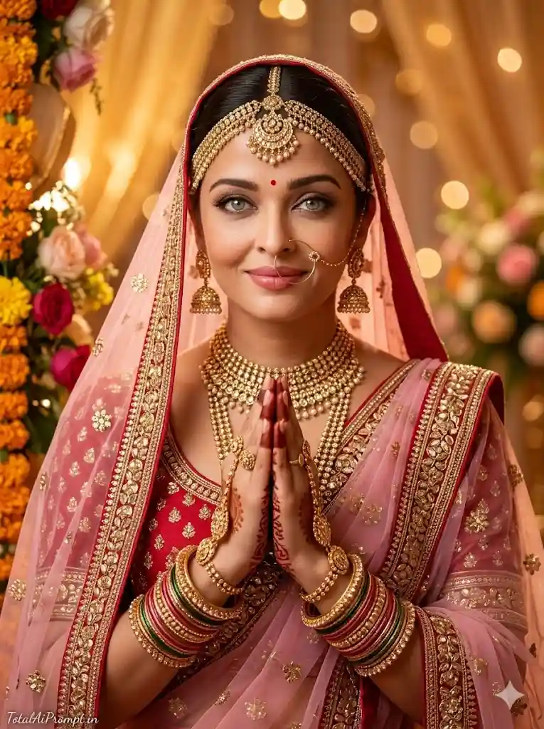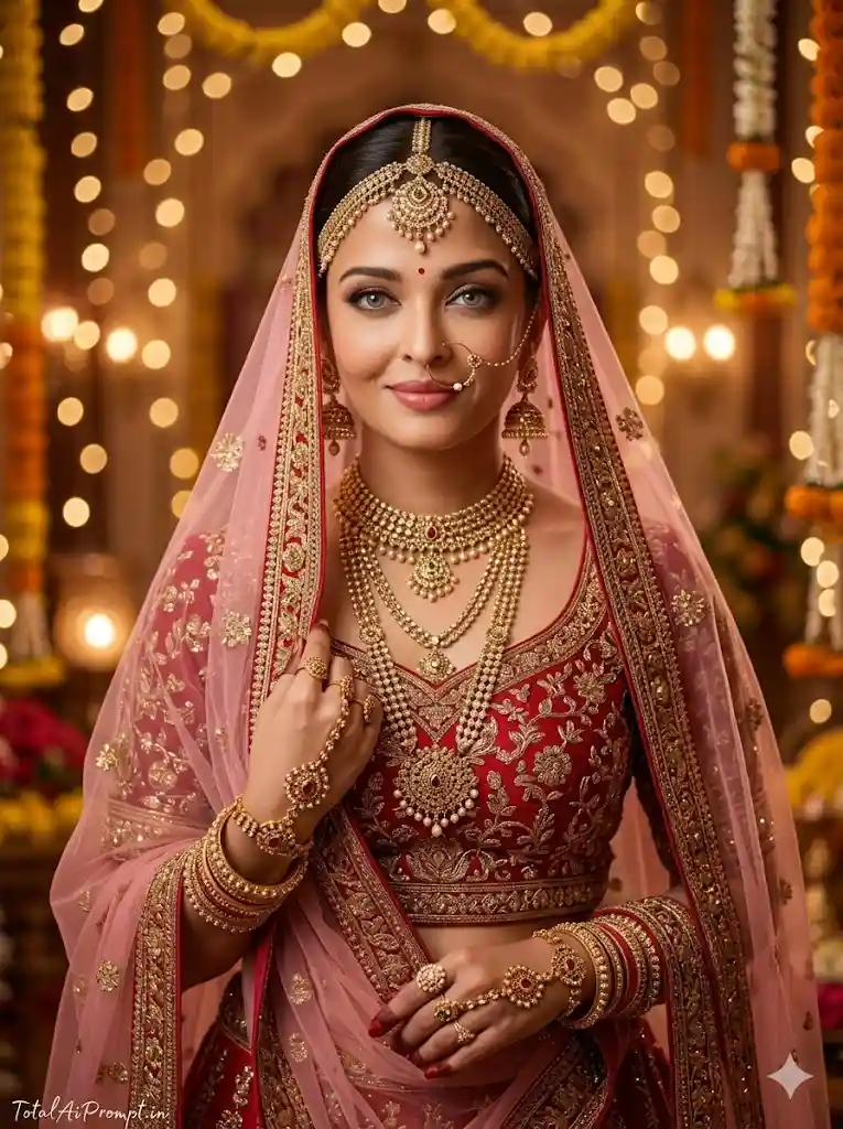 Create an ultra-realistic, cinematic-quality vertical (3:4) royal bridal portrait using the uploaded reference image, where the face is preserved with absolute precision—an exact 100% copy with no alterations of any kind (no face swap, no morphing, no beautification, no structural or tonal adjustments; eyes, nose, lips, skin texture, expression, and makeup must remain completely unchanged), enforcing strict identity lock with full reference priority; depict a young Indian bride dressed in an opulent red bridal lehenga choli adorned with intricate gold embroidery, paired with a soft pink sheer dupatta draped gracefully over her head, complemented by traditional jewelry including a maang tikka, layered gold necklaces, jhumka earrings, bangles, rings, and detailed hand ornaments, posed elegantly with calm, composed hand placement; set against a warm, festive wedding background featuring soft golden bokeh lighting that enhances a luxurious celebratory ambiance; apply soft, warm, cinematic lighting to naturally highlight fabric textures, fine embroidery, skin realism, and metallic reflections with lifelike depth and detail; ensure every element appears natural, high-resolution, and photorealistic with no artificial or exaggerated effects; add the text “TotalAiPrompt.in” in the bottom-left corner in a small, thin, handwritten cursive font with subtle premium elegance in white or soft off-white color; negative prompts and restrictions: no face distortion, no identity change, no asymmetry, no blur, no over-sharpening, no unrealistic skin smoothing, no color banding, no lighting inconsistency, no extra limbs or artifacts, no exaggerated features, no duplicate face, no CGI or cartoonish rendering, no watermark, no logo, no additional text beyond specified signature.