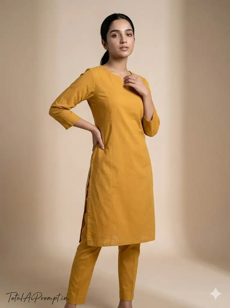 Create an ultra-realistic 8K HD full-body fashion editorial portrait in a strict 3:4 vertical aspect ratio with a professional full-frame DSLR studio aesthetic and authentic 85mm lens rendering, delivering RAW-level ultra-detailed clarity and a modern high-end campaign look; the uploaded reference face must be used exactly as provided under an uncompromising FACE LOCK policy with zero modification—no reshaping, no beautification, no smoothing filters, no artificial glow, and no changes to facial identity, jawline, skin tone, or eye structure, ensuring razor-sharp Ultra HD eye detail, clearly visible natural pores, lifelike skin texture, absolutely no blur on the face, and the face remaining the sharpest element in the frame; compose the shot in full-body vertical framing with her standing slightly angled rather than straight-on, one hand confidently placed on her waist while the other gently touches the neckline of her kurti, chin subtly raised with direct, self-assured eye contact and a strong centered composition; dress her in a solid mustard yellow kurti featuring modern structured cuts with sharply defined seam lines and precise tailoring details visible in HD, paired with slim trousers showing crisp crease lines and a realistic matte fabric texture; style the hair in a sleek low ponytail with a smooth refined finish and clean defined hairline, makeup in soft glam style with subtle contouring, defined brows, neutral eyeshadow, glossy nude lips, and a natural skin glow without artificial shine; set the scene against a soft neutral beige studio backdrop with a minimal uncluttered environment and a subtle shadow gradient to create depth; apply soft studio key lighting from the front-left with gentle fill light to balance shadows, a clean natural shadow beneath the feet, and HDR-balanced exposure for maximum clarity and accurate skin tone rendering; maintain extreme photorealism with ultra-detailed 8K sharpness, no depth blur on the face, no plastic skin effect, and true-to-life editorial finish, strictly avoiding blur, soft focus, oversmoothing, cartoon styling, distorted anatomy, extra fingers, watermark, logo artifacts, or any unwanted text; add the text “TotalAiPrompt.in” at the bottom-left corner in a small handwritten signature-style font with thin cursive strokes, subtle premium elegance, in white or soft off-white color.