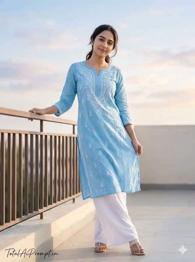 Generate an ultra-realistic 8K HD full-body lifestyle portrait in a strict 3:4 vertical aspect ratio using a professional DSLR aesthetic with authentic 85mm portrait lens depth and RAW-level ultra-detailed clarity, ensuring sharp focus from head to toe; the uploaded reference face must be applied exactly as provided under an absolute FACE LOCK with zero modification policy—no reshaping, no beautification, no smoothing filters, no glow effects, and no alterations to facial structure, skin tone, jawline, or eye shape, preserving complete identity accuracy with razor-sharp Ultra HD eye detail, visible natural pores, realistic skin texture, zero blur on the face, and the face remaining the sharpest element in the entire frame; compose the shot in full-body vertical framing with her standing sideways near a terrace railing rather than leaning fully, one hand gently resting on the railing while the other lightly holds the edge of her kurti, head subtly tilted toward the sunlight with a calm, soft smile and natural eye contact, weight shifted onto one leg for relaxed elegance; dress her in a sky-blue cotton kurti featuring delicate white detailing with embroidery and stitching clearly defined in HD precision, paired with flowing palazzo pants showing natural crease lines and clearly visible light sandals, ensuring cotton fabric texture appears crisp and lifelike; style hair in a loosely tied low ponytail with a few natural strands near the face, makeup minimal with light blush, natural lip tint, defined brows, and a healthy skin glow without artificial shine; set the background on an open terrace under a wide morning sky with soft pastel clouds in the distance, muted neutral flooring and railing, and a peaceful uncluttered atmosphere; apply soft morning sunlight from the side to create a gentle rim light with balanced highlights and shadows, natural HDR exposure, and accurate skin tone preservation; maintain extreme photorealism with ultra-detailed 8K clarity, no depth blur on the face, no plastic skin texture, and true-to-life rendering; strictly avoid blur, soft focus, oversmoothing, cartoon styling, distorted anatomy, extra fingers, watermark, logo artifacts, or any unwanted text; add the text “TotalAiPrompt.in” at the bottom-left corner in a small handwritten signature-style font with thin cursive strokes, subtle premium elegance, in white or soft off-white color.