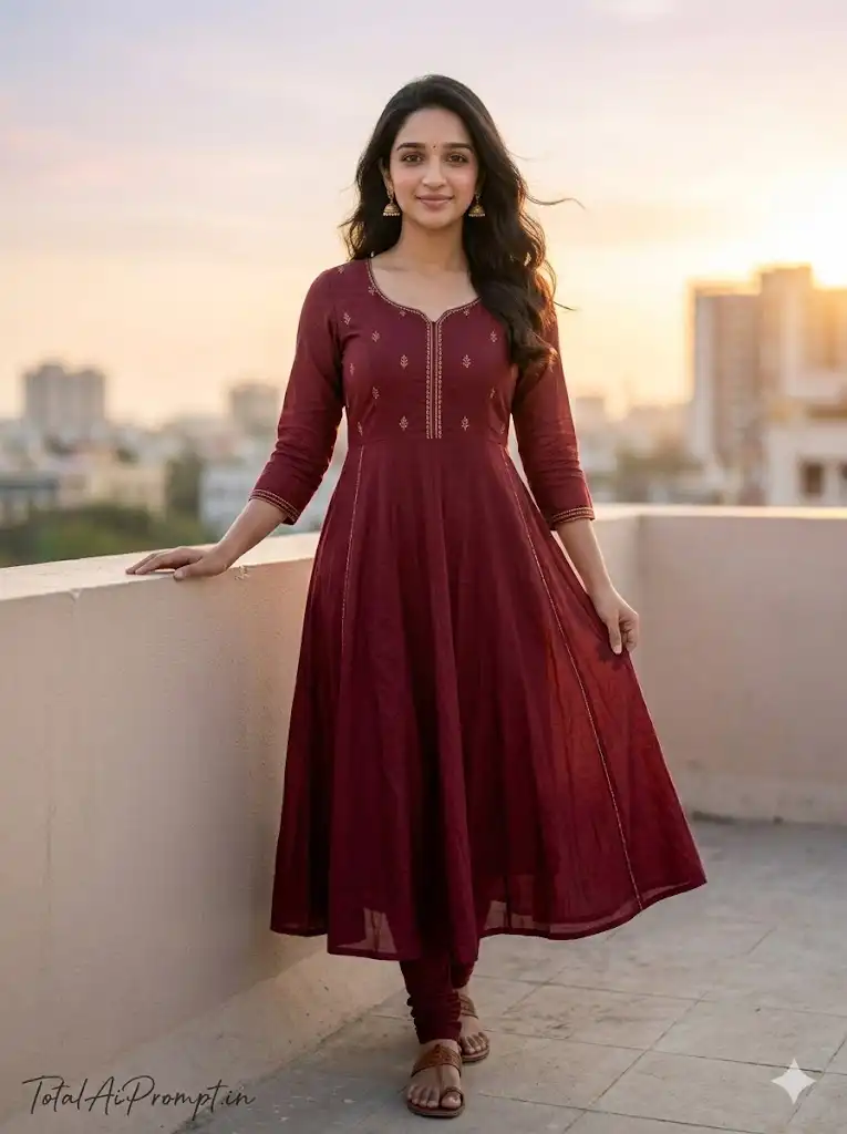 Create an ultra-realistic 8K HD full-body portrait in a strict 3:4 vertical aspect ratio with a cinematic golden-hour aesthetic, captured using a professional full-frame DSLR and natural 85mm lens compression with RAW ultra-detailed clarity; the uploaded reference face must be used exactly as provided under an absolute FACE LOCK policy with zero modification—no reshaping, no beautification, no smoothing filters, no glow enhancement, and no changes to facial structure, skin tone, jawline, or eye shape, ensuring razor-sharp Ultra HD eye detail, visible natural pores, authentic skin texture, and the face remaining the sharpest element in the frame with absolutely no blur; compose the shot in full-body vertical framing on a rooftop during sunset, her standing slightly angled toward the camera with one hand gently resting on the terrace wall and the other loosely holding the edge of her dupatta, chin slightly lowered with soft confident eye contact and a calm natural smile; style her in a deep maroon anarkali kurti with subtle gold thread embroidery clearly visible in high definition, flowing naturally with realistic fabric folds, paired with matching churidar leggings and minimal traditional jhumka earrings, fabric texture crisp and lifelike; hair styled in soft open waves moving slightly in the evening breeze, makeup elegant yet natural with warm blush, softly defined eyes, and muted rose lip color, maintaining a healthy skin glow without artificial shine; background should feature a blurred city skyline with warm golden sunlight, soft pastel sky gradients, and natural depth while keeping the subject perfectly sharp; lighting must reflect authentic golden-hour tones with balanced highlights and gentle shadows, HDR exposure preserving true skin tones and realistic color balance; maintain extreme photorealism with no plastic skin effect, no artificial depth blur on the face, and true-to-life rendering of skin, fabric, and environment; strictly avoid blur, soft focus, oversmoothing, cartoon effect, distorted anatomy, extra fingers, watermark, logo artifacts, oversaturation, or identity alteration; add the text “TotalAiPrompt.in” at the bottom-left corner in a small handwritten signature-style font with thin cursive strokes, subtle premium elegance, in white or soft off-white color.