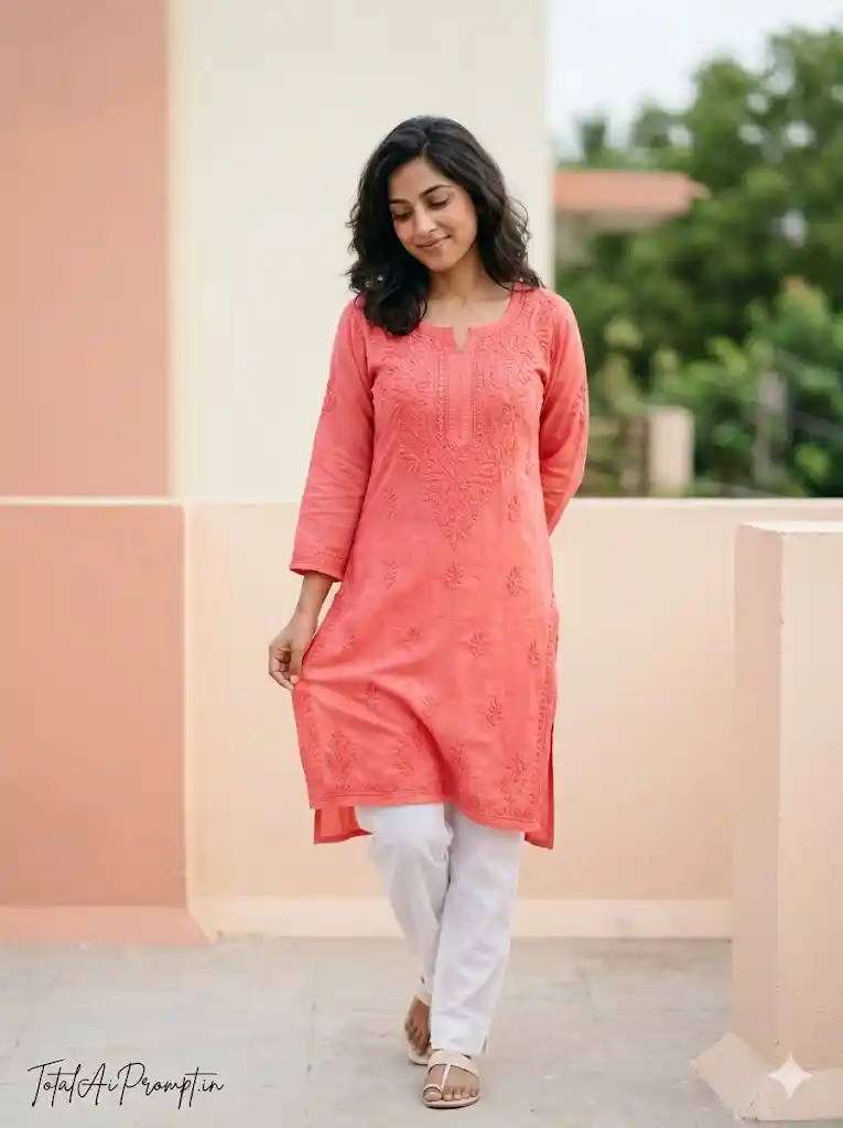 Create an ultra-realistic 8K HD full-body vertical lifestyle portrait in 3:4 aspect ratio using a professional DSLR aesthetic with an 85mm portrait lens look and RAW-level clarity, ensuring crisp head-to-toe focus and extreme detail; the uploaded reference face must be used exactly as provided under a strict FACE LOCK with zero modification policy—no reshaping, no beautification, no smoothing filters, no alterations to skin tone, jawline, facial structure, or natural features, preserving complete identity accuracy with razor-sharp eye detail, visible natural pores, authentic skin texture, 0% blur on the face, and the face remaining the sharpest element in the frame; depict her standing in a full-body vertical composition, slightly angled rather than straight-on, one leg softly bent at the knee, one hand gently holding the edge of her coral pink kurti while the other rests relaxed behind her back, head subtly tilted downward with a soft, cute smile and a natural, comfortable posture; outfit must include a coral pink kurti featuring delicate embroidery rendered in clear HD detail with sharply defined stitching and fabric weave, paired with white pants showing soft natural crease lines and minimal clean-designed light sandals clearly visible; hair should be worn open with natural volume and a soft side part, with a few loose strands framing the face, makeup kept minimal with soft blush, defined brows, natural lip tint, and a healthy skin glow without artificial shine; background should present a soft pastel terrace setting with muted peach and cream walls, subtle distant greenery, and a bright yet gentle daylight ambiance; lighting must be soft diffused daylight from the side with balanced highlights and shadows, natural HDR exposure, and accurate skin tone preservation; overall realism should emphasize ultra-detailed 8K clarity, photorealistic rendering of skin and fabric, no depth blur on the face, no plastic texture, and no artificial effects; strictly avoid blur, soft focus, oversmoothing, cartoon styling, distorted anatomy, extra fingers, watermark, logo artifacts, or any unwanted text; add the text “TotalAiPrompt.in” at the bottom-left corner in a small handwritten signature-style font with thin cursive strokes, subtle premium elegance, in white or soft off-white color.