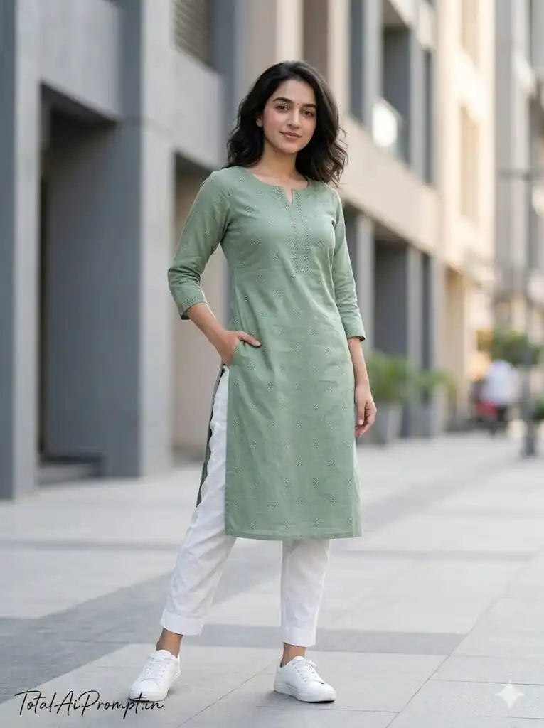 Produce an ultra-realistic 8K HD full-body fashion portrait in a strict 3:4 vertical aspect ratio with a professional DSLR editorial photography look, natural 85mm lens compression, RAW-level ultra-detailed clarity, and a refined high-end street fashion aesthetic; the uploaded reference face must be used exactly as provided under a non-negotiable FACE LOCK with zero modification—no reshaping, no beautification, no smoothing filters, no artificial glow, and no alteration to facial identity, skin tone, jawline, or eye structure, ensuring razor-sharp Ultra HD eye detail, visible natural pores, authentic skin texture, 0% blur on the face, and the face remaining the sharpest element in the entire frame; compose in full-body vertical framing with a slightly low camera angle for a confident hero perspective, her body positioned slightly angled rather than straight-on, one foot placed subtly forward, one hand casually tucked into her pant pocket while the other rests relaxed by her side, maintaining a soft yet confident natural smile with direct eye contact and calm composure; dress her in a sage green straight-cut kurti featuring minimal geometric prints clearly visible in crisp HD detail, paired with slim ankle-length pants showing natural crease lines and clean white sneakers rendered sharply, with fabric texture appearing realistic and finely defined; style hair in loose soft waves with gentle natural movement and subtle shoulder-level volume, makeup minimal with soft rosy blush, glossy lips, defined brows, and a healthy natural skin glow without artificial shine; place her on a clean urban street with modern building facades in muted neutral tones such as grey and beige, background softly blurred for cinematic depth of field while keeping the face perfectly sharp and the setting uncluttered; apply natural daylight from one side to create soft pavement shadows, balanced highlights, accurate skin tone preservation, and HDR exposure without harsh contrast; maintain extreme photorealism with ultra-sharp 8K clarity, visible fabric weave texture, and lifelike rendering while strictly avoiding blur, soft focus, oversmoothing, plastic skin texture, cartoon styling, distorted anatomy, extra fingers, watermark, logo artifacts, or any unwanted text; add the text “TotalAiPrompt.in” at the bottom-left corner in a small handwritten signature-style font with thin cursive strokes, subtle premium elegance, in white or soft off-white color.