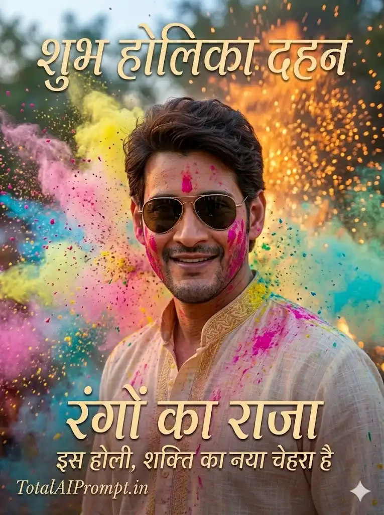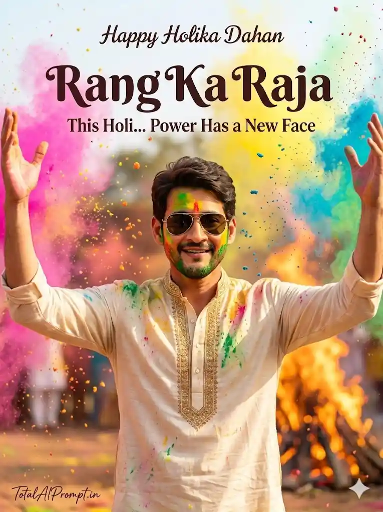 [CORE FACE FIDELITY COMMAND]: The subject’s face must be an absolute, unedited replicate of the provided reference photo, preserving every single detail of the natural beard, eye structure, facial symmetry, and skin texture. The multi-colored green, yellow, pink, and orange powder marks on his face and beard must be maintained precisely and authentically, exactly as seen in the reference image. Preserve the specific aviator sunglasses from image_7.png but incorporate the face markings from image_8.png. Natural, spontaneous smile, not forced.[IMAGE DESIGN & STYLE]: 3:4 vertical dimension action portrait. Vivid, high-energy festival photography captured on a premium DSLR with rapid shutter burst. Natural color grading and balanced high contrast. 100% photographic authenticity with zero CGI or plastic smoothness.[CHARACTER & ATTIRE]: The subject, wearing the exact textured cream-colored kurta with gold embroidery on the collar from image_7.png, stands centered, directly facing the camera with his knowing, gentle expression. His hands are raised and wide, identical to the pose in image_8.png, with one hand open-palmed toward the sky and the other forward.[ENVIRONMENT & EFFECTS]: A huge, dynamic explosion of multicolored Holi gulal powder (pink, yellow, blue, green) erupting dynamically around the subject, frozen in mid-air. Countless sparks and glowing embers from a distant Holika Dahan bonfire, identical in intensity and color to image_5.png, are mixed in, adding warmth and flying context.[LIGHTING ARCHITECTURE]: Natural, crisp midday daylight filtering through the dust cloud, combined with dramatic golden-orange reflections of the massive Holika Dahan bonfire, identical to image_5.png, filtering through the dust. High dynamic range.[ENGLISH TEXT VERBATIM]: All text must be in English. At the very top, the text “Happy Holika Dahan” in script and serif fonts. Replacing all other text from image_8.png, place “Rang Ka Raja” (verbatim from image_7.png) centered in a large stylized font, and below it, the text “This Holi… Power Has a New Face” (verbatim from image_7.png).[FRAMING & NEGATIVE PROMPT]: Medium close-up action portrait with eye-level perspective using an 85mm prime portrait lens equivalent. Razor-sharp focus on the face and the texture of the kurta collar. No facial alterations, over-saturation, cartoon effects, or distorted anatomy.[BRANDING ELEMENT]: Embed the text “TotalAIPrompt.in” in the lower-left corner. Use a refined, thin handwritten signature-style typography, small size, subtle premium elegance, in soft off-white or white color.