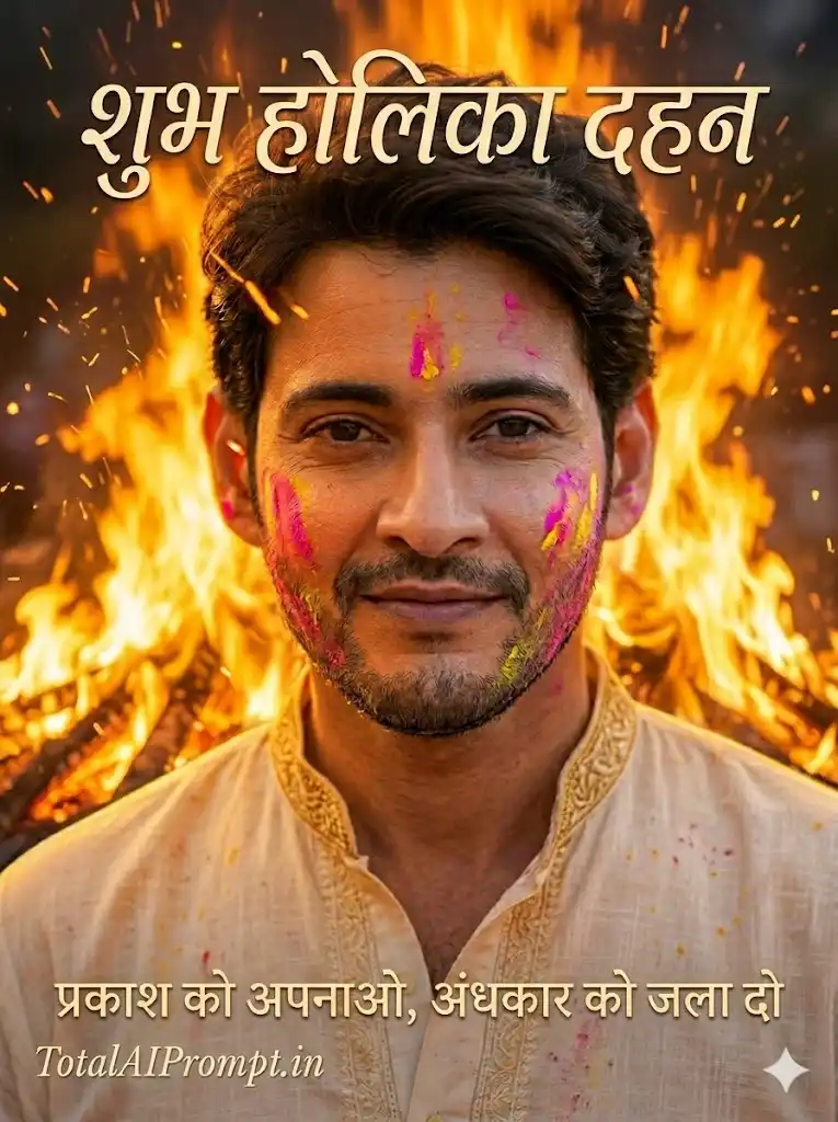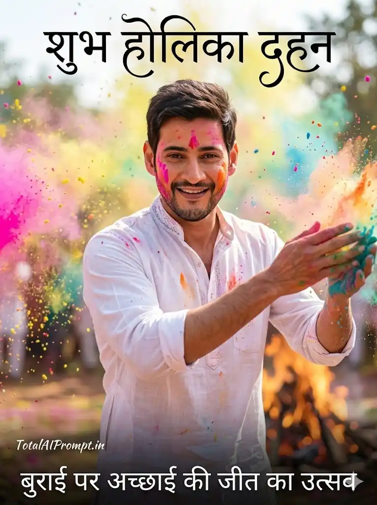 [FACIAL FIDELITY LOCK]: The subject’s face must be an absolute, unedited replicate of the provided reference photo, preserving every single detail of the natural beard, eye structure, facial symmetry, and skin texture without any artificial smoothing or reshaping. The colorful pink and orange powder application pattern on his face must be maintained precisely and authentically. Ultra-sharp facial focus with zero motion blur.[IMAGE DESIGN & STYLE]: 3:4 vertical dimension portrait. Action-packed outdoor festival photography captured on a premium DSLR. High-speed shutter effect freezing motion in fine detail. 100% photographic authenticity.[CHARACTER & ATTIRE]: The subject is caught mid-movement, centered, directly facing the camera with a genuine, spirited smile. Wearing a durable traditional white cotton kurta with rolled-up sleeves and visible embroidery on the collar. Hands are active, one slightly lifted.[ENVIRONMENT & EFFECTS]: A huge, dynamic explosion of multicolored Holi gulal powder (pink, yellow, blue, green) erupting around the subject, frozen in mid-air. Fine, colorful dust is hanging everywhere, and colorful smoke is visible. The massive, roaring bonfire from image_5.png is visible further in the background, out of focus, adding warmth and context.[LIGHTING ARCHITECTURE]: Natural midday sunlight filtering through the cloud of colorful dust, creating a beautiful diffused light effect. Backlighting from the sun catches the edges of the dust particles.[HINDI TEXT VERBATIM]: All text must be in Hindi script. Place “शुभ होलिका दहन” at the very top using a mix of clean serif and elegant script fonts. Place “बुराई पर अच्छाई की जीत का उत्सव” at the very bottom in a refined serif font.[FRAMING & NEGATIVE PROMPT]: Action-oriented close-up portrait with eye-level lens perspective using a 50mm prime lens. Razor-sharp focus on the face. No facial alterations, expression changes, plastic smoothness, CGI water/powder effects, over-saturation, watermarks, or extra limbs.[BRANDING ELEMENT]: Embed the text “TotalAIPrompt.in” in the lower-left corner. Use a refined, kaushan script font, small size, subtle premium elegance, in soft off-white or white color.