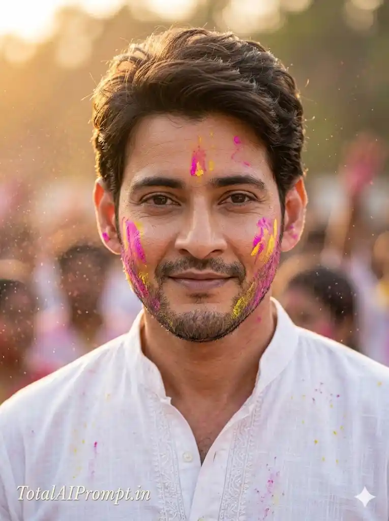 Physical Details: Their authentic facial identity and natural hair aesthetics must be perfectly duplicated. The skin, hair, and hands are heavily dusted with brilliant, multi-colored Holi powder (gulal).