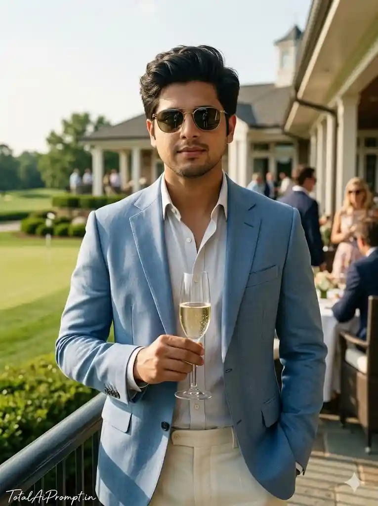 Generate a hyper-realistic, cinematic portrait of a young man standing on a refined golf club terrace during a bright sunny afternoon, capturing a clean, minimal luxury atmosphere with a subtle “generational wealth” aesthetic. The subject must exactly match the face and hairstyle from the provided reference image with zero modification, preserving full identity accuracy. He is dressed in a tailored light blue blazer paired with cream trousers, wearing elegant sunglasses and casually holding a champagne glass, projecting effortless sophistication. Lighting should be natural and sunlit, with soft highlights and realistic shadows that enhance true-to-life skin tones, fabric textures, and environmental depth. Every element—including skin detail, clothing folds, reflections, and background—must appear naturally lifelike and free from artificial enhancement, with a gentle cinematic film grain added for realism without degrading clarity. The composition must follow a vertical 3:4 aspect ratio. Include the text “TotalAiPrompt.in” at the bottom-left corner in a small, thin, handwritten cursive font, styled in white or soft off-white for a subtle premium finish. Negative prompts: avoid any facial distortion or identity change, altered hairstyle, asymmetry, unrealistic skin smoothing, exaggerated lighting, harsh shadows, incorrect anatomy, extra limbs, blur, low resolution, noise artifacts, oversharpening, cartoonish or CGI effects, color banding, or any deviation from authentic photorealism and natural lighting.