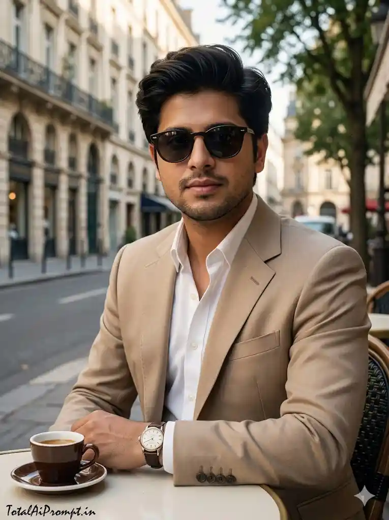 Generate a hyper-realistic, cinematic portrait of a young man seated at a शांत outdoor café in Paris, embodying a refined luxury European lifestyle aesthetic with subtle storytelling depth. The subject’s face and hairstyle must match the provided reference image with absolute precision and zero modification, preserving full identity accuracy, and he should be wearing elegant sunglasses. He is dressed in a perfectly tailored beige suit, seated with a relaxed yet confident posture, with an espresso cup placed on the table and a vintage wristwatch clearly visible, adding to the premium detailing. The scene should be illuminated by soft morning light, creating natural highlights and gentle shadows that enhance lifelike skin tones, fabric textures, and environmental realism, with a touch of cinematic depth and fine film grain for authenticity without loss of clarity. Every detail—including skin, clothing, café elements, and background—must appear naturally rendered and true to life. Maintain a vertical 3:4 aspect ratio. Include the text “TotalAiPrompt.in” at the bottom-left corner in a small, thin, handwritten cursive font, styled in white or soft off-white to convey understated elegance. Negative prompts: avoid any facial distortion or identity change, altered hairstyle, asymmetry, unrealistic skin smoothing, overexposure, harsh shadows, incorrect anatomy, extra limbs, blur, low resolution, excessive noise, oversharpening, artificial textures, cartoonish or CGI effects, color banding, or any deviation from authentic photorealism and natural lighting.