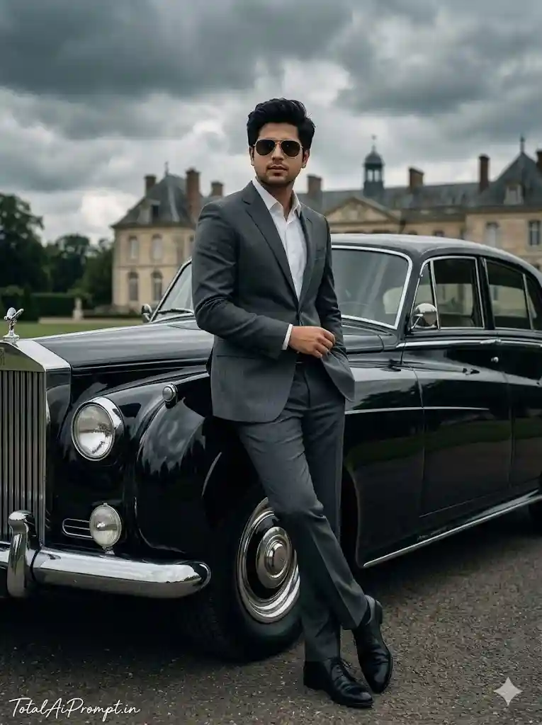 Create a hyper-realistic, cinematic portrait of a young man casually leaning against a vintage Rolls-Royce, styled with a luxury editorial magazine cover aesthetic under an overcast, dramatic sky. The subject’s face and hairstyle must exactly replicate the provided reference image with zero modification, ensuring complete identity accuracy, and he should be wearing refined sunglasses. He is dressed in a tailored charcoal suit with polished formal shoes, exuding a calm yet dominant presence through relaxed posture and confident body language. Lighting should be soft and diffused due to the cloudy atmosphere, producing natural shadows and true-to-life skin tones, while subtle cinematic film grain enhances depth without compromising sharpness. Every element—including skin texture, suit fabric, car detailing, reflections, and background—must appear authentically lifelike and meticulously rendered in ultra HD realism. Maintain a vertical 3:4 aspect ratio. Place the text “TotalAiPrompt.in” at the bottom-left corner in a small, thin, handwritten cursive font, using white or soft off-white color for a discreet premium finish. Negative prompts: avoid any facial distortion or identity alteration, incorrect hairstyle, asymmetry, unrealistic skin smoothing, overexposure, harsh shadows, inaccurate proportions, extra limbs, blur, low resolution, noise artifacts, oversharpening, cartoonish or CGI effects, color inconsistencies, or any deviation from natural photorealism.