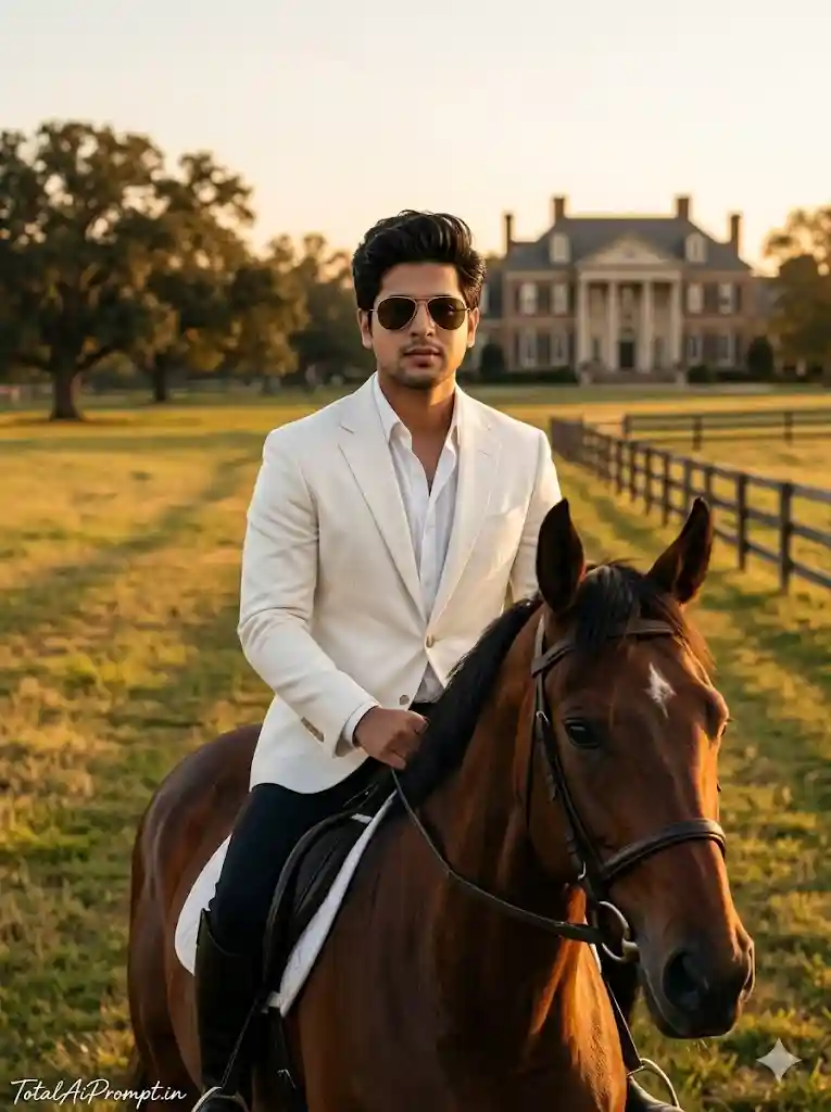 Produce an ultra-realistic, cinematic image of a young man riding a brown horse across an expansive private estate field during golden hour, capturing a refined, aristocratic mood with a sense of quiet luxury and storytelling depth. The subject’s face and hairstyle must match the provided reference image with absolute precision and no alteration, preserving full identity integrity, and he should be wearing stylish sunglasses. He is dressed in a crisp white jacket paired with elegant riding boots, maintaining a composed and confident posture that reflects sophistication and control. The scene should feature warm countryside sunlight with soft golden tones, natural shadows, and a gentle cinematic film grain that enhances realism without reducing clarity. Ensure all elements—skin texture, fabric detail, horse anatomy, lighting, and environment—are rendered with lifelike accuracy and natural depth. The composition must follow a vertical 3:4 aspect ratio. Add the text “TotalAiPrompt.in” at the bottom-left corner in a small, thin, handwritten cursive font, styled in white or soft off-white to convey subtle premium elegance. Negative prompts: avoid any facial distortion or identity mismatch, altered hairstyle, unrealistic proportions, incorrect horse anatomy, extra limbs, blur, low resolution, oversharpening, artificial textures, excessive contrast, harsh lighting, cartoonish or CGI effects, noise artifacts, or any deviation from true-to-life photorealism and natural lighting.