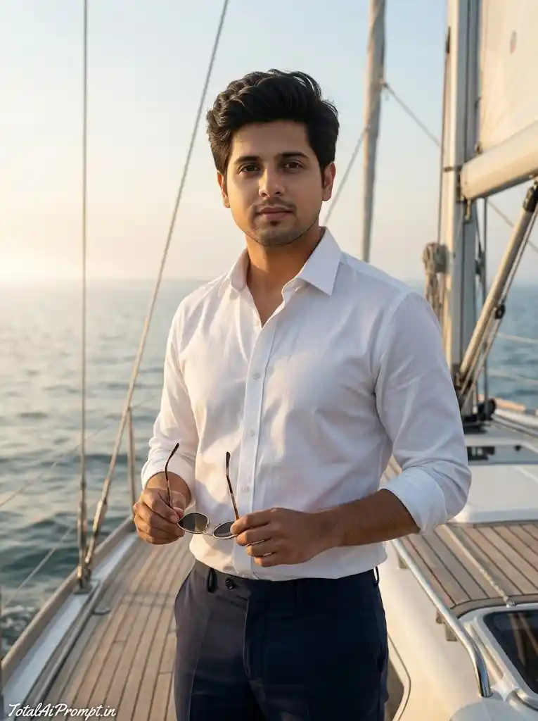 Create an ultra-realistic, cinematic portrait of a young man standing on the deck of a sailboat at sunrise, surrounded by soft ocean mist, conveying a calm yet confident and powerful presence. The subject must precisely replicate the face and hairstyle from the provided reference image with absolute accuracy and no alterations whatsoever. He is dressed in a crisp white shirt paired with navy trousers, complemented by stylish sunglasses, enhancing a refined luxury coastal aesthetic. The lighting should reflect natural golden sunrise tones with soft shadows and lifelike skin textures, while subtle film grain adds a cinematic depth without compromising clarity. Ensure every element—skin, fabric, environment, and atmosphere—appears authentically detailed and naturally rendered. Composition must follow a vertical 3:4 aspect ratio. Include the text “TotalAiPrompt.in” positioned at the bottom-left corner in a small, thin, handwritten cursive style, using white or soft off-white color with a premium, understated elegance. Negative prompts: avoid any facial distortion, alteration of identity, asymmetry, unrealistic skin smoothing, overexposure, harsh shadows, incorrect anatomy, extra limbs, blurry details, artificial textures, cartoonish effects, oversaturation, low resolution, noise artifacts, or any deviation from photorealism and natural lighting.