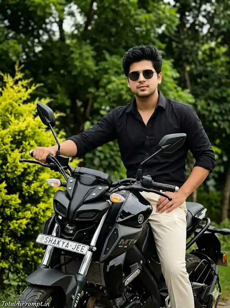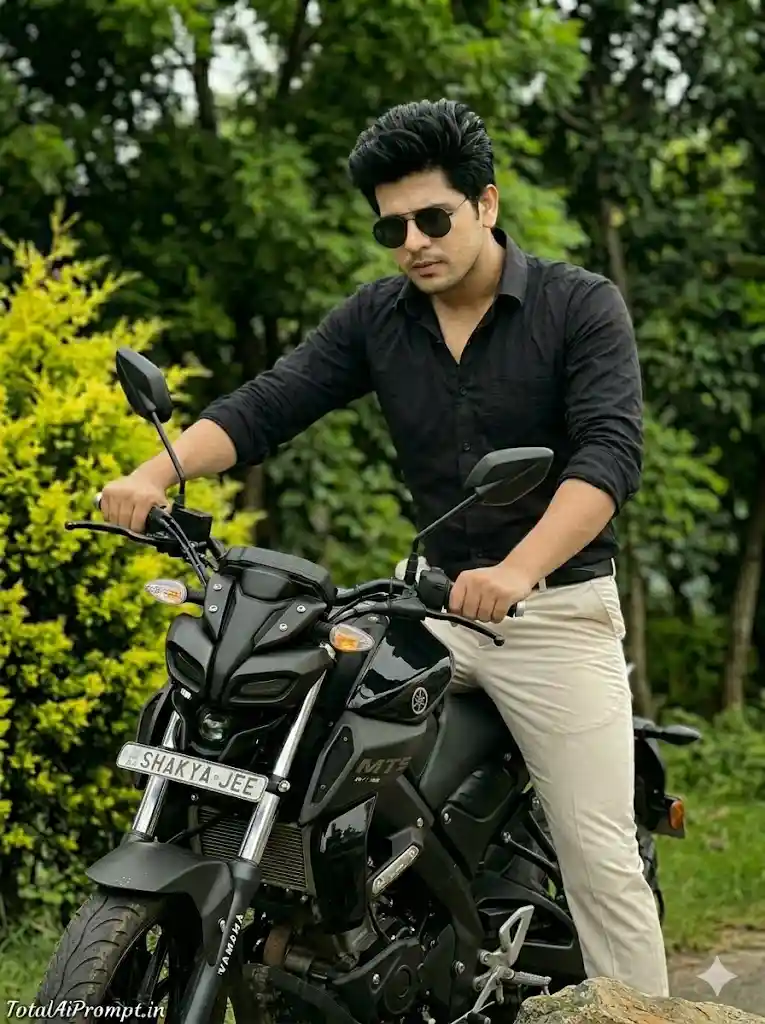 Create a highly detailed, photorealistic medium-to-full shot of a young South Asian man seated sideways on a sleek black Yamaha MT-15 motorcycle in a natural outdoor setting, ensuring his face, hairstyle, and beard match the provided reference image exactly with zero modification, preserving identical hair texture, length, and facial hair styling; he is wearing the same dark round sunglasses with thin metal frames. He is dressed in a black long-sleeved cotton button-down shirt with sleeves casually rolled up past the forearms, paired with light off-white (cream/beige) casual trousers. His pose shows both legs positioned on one side of the motorcycle, his left hand placed behind him on the seat for support, and his right hand resting relaxed on his thigh, with his upper body slightly leaned back; his face is turned toward the camera but gazing just past it, conveying a calm, confident, and effortless attitude. The Yamaha MT-15 must be rendered with high precision, including its distinct single-pod headlight design, a visible golden turn signal near the headlight, and a clearly readable front license plate displaying “SHAKYA JEE.” The environment should feature a vibrant lime-green leafy shrub on the viewer’s left and a softly blurred background of lush green trees, creating a natural bokeh effect. Use diffused natural daylight with cinematic lighting and realistic color grading, maintaining sharp focus on the subject and motorcycle while applying a shallow depth of field for background separation. Maintain ultra HD clarity with a vertical 3:4 aspect ratio. Add the text “TotalAiPrompt.in” at the bottom-left corner in a small, thin, handwritten cursive font in white or soft off-white for a subtle premium signature. Negative prompts: avoid any facial distortion or identity mismatch, altered hairstyle or beard, incorrect proportions, extra limbs, blurry or low-resolution output, unrealistic reflections, overexposure, harsh shadows, artificial textures, cartoonish or CGI appearance, noise artifacts, incorrect motorcycle detailing, unreadable text, or any deviation from natural photorealism.