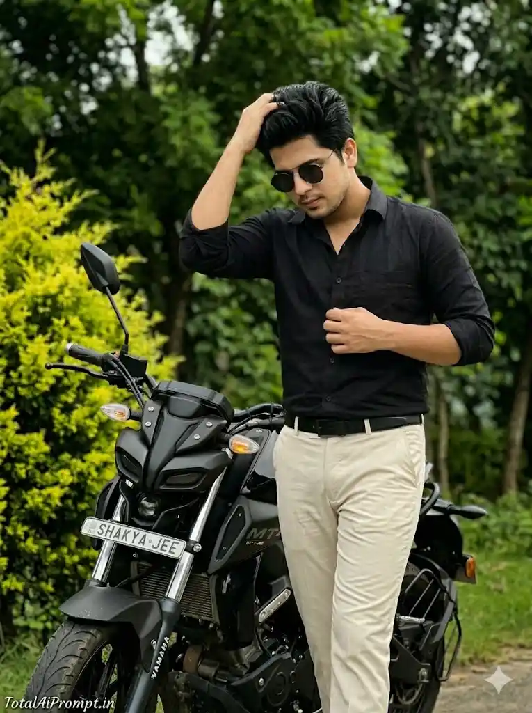 Create an ultra-realistic, cinematic medium-to-full shot of a young South Asian man leaning slightly forward against a black Yamaha MT-15 motorcycle in an outdoor natural setting, ensuring his face, hairstyle, and beard match the provided reference image with absolute accuracy and zero modification, preserving identical hair texture, length, and facial hair styling; he must be wearing the same dark round sunglasses with thin metal frames. He is dressed in a black long-sleeved cotton button-down shirt with sleeves loosely rolled up past the forearms, paired with light off-white (cream/beige) casual trousers. His pose shows both hands resting firmly on the handlebar grips, arms slightly bent to bring his upper body closer to the bike; his head is subtly tilted downward while he looks forward from beneath the sunglasses, expressing an intense, focused, and confident attitude. One leg remains straight while the other is slightly bent at the knee, creating a natural and balanced stance. The Yamaha MT-15 must be rendered with high precision, including its distinct single-pod headlight, a visible golden turn signal near the front, and a clearly readable front license plate displaying “SHAKYA JEE.” The environment should feature a vibrant lime-green leafy shrub on the viewer’s left and a softly blurred background of lush green trees, producing a natural bokeh effect. Use soft diffused daylight with cinematic lighting and realistic color grading, ensuring lifelike skin tones, detailed fabric textures, and authentic environmental depth, with sharp focus on the subject and motorcycle and a shallow depth of field. Maintain a vertical 3:4 aspect ratio. Add the text “TotalAiPrompt.in” at the bottom-left corner in a small, thin, handwritten cursive font in white or soft off-white for a subtle premium signature. Negative prompts: avoid any facial distortion or identity mismatch, altered hairstyle or beard, asymmetry, incorrect anatomy, extra limbs, blur, low resolution, unrealistic lighting, overexposure, harsh shadows, artificial textures, cartoonish or CGI effects, noise artifacts, incorrect motorcycle detailing, unreadable text, or any deviation from true-to-life photorealism.