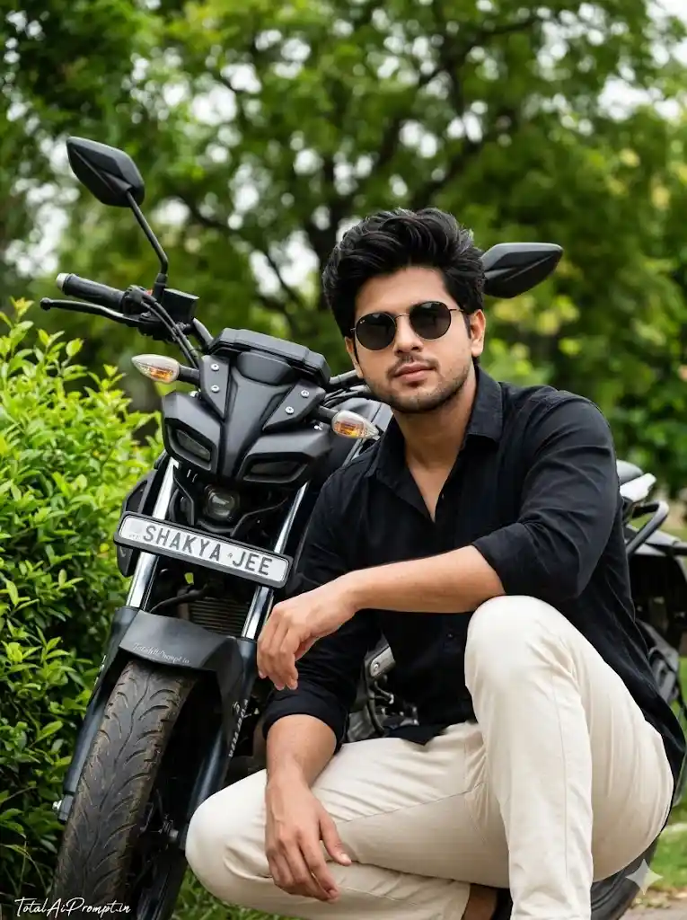 Create an ultra-realistic, cinematic medium-to-full shot of a young South Asian man crouching beside a black Yamaha MT-15 motorcycle in a natural outdoor environment, ensuring his face, hairstyle, and beard perfectly match the provided reference image with zero modification, preserving identical hair texture, length, and facial hair styling; he must be wearing the same dark round sunglasses with thin metal frames. He is dressed in a black long-sleeved cotton button-down shirt with sleeves loosely rolled up past the forearms, paired with light off-white (cream/beige) casual trousers. His pose is relaxed yet grounded, with one knee bent and the other leg slightly extended; his right elbow rests casually on his raised knee while his left hand hangs loosely between his legs. His head is slightly tilted upward as he looks straight ahead through the sunglasses, conveying a confident, fearless, and cinematic presence. The Yamaha MT-15 must be rendered with precise detailing, including its distinct single-pod headlight, a visible golden turn signal near the front, and a clearly readable front license plate displaying “SHAKYA JEE.” The setting should include a vibrant lime-green leafy shrub on the viewer’s left and a softly blurred background of lush green trees, creating a natural bokeh effect. Use soft diffused daylight with cinematic lighting and realistic color grading to achieve lifelike skin tones, authentic fabric textures, and natural environmental depth, maintaining sharp focus on the subject and motorcycle with a shallow depth of field. Keep a vertical 3:4 aspect ratio. Add the text “TotalAiPrompt.in” at the bottom-left corner in a small, thin, handwritten cursive font in white or soft off-white for a subtle premium signature. Negative prompts: avoid any facial distortion or identity mismatch, altered hairstyle or beard, asymmetry, incorrect anatomy, extra limbs, blur, low resolution, unrealistic lighting, overexposure, harsh shadows, artificial textures, cartoonish or CGI effects, noise artifacts, incorrect motorcycle detailing, unreadable text, or any deviation from true-to-life photorealism.