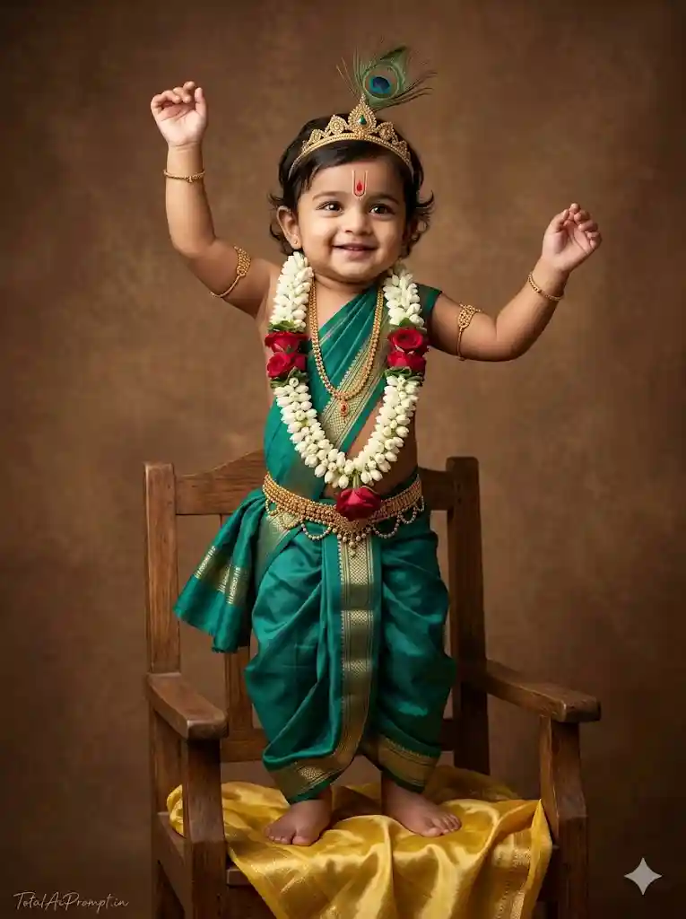 Generate an ultra-realistic, cinematic high-resolution portrait where the face matches the reference [uploaded image] exactly with zero alteration, preserving authentic facial structure, expressions, proportions, and natural skin texture. Depict a divine infant Lord Krishna captured in a joyful action moment standing playfully on a wooden chair, posed as if dancing with both arms raised and displaying a radiant, mischievous smile that reflects divine innocence. He is dressed in a traditional teal-green silk dhoti featuring elegant gold-bordered patterns with a matching silk sash draped diagonally across his chest, rendered with highly detailed fabric folds and realistic texture. On his head rests a delicate golden crown adorned with a small iridescent peacock feather. His traditional jewelry includes a gold beaded waist belt (kamarband), ornate golden armbands, a long gold necklace, and thin gold bracelets, while a bright red Vaishnav tilak is clearly marked on his forehead. Around his neck hangs a thick fragrant garland made of fresh white jasmine and deep red roses. The wooden chair beneath him is draped with shimmering yellow silk fabric, and the background features a warm textured brown studio backdrop that enhances the sacred yet playful mood. Use soft professional studio lighting with subtle volumetric highlights to illuminate the child’s joyful expression and emphasize the rich textures of silk, gold, and flowers, creating natural shadows and lifelike depth for a photorealistic 8K masterwork with cinematic clarity and divine atmosphere. Maintain a vertical 3:4 aspect ratio and place the subtle signature text “TotalAiPrompt.in” at the bottom-left corner in a small, thin handwritten cursive style using white or soft off-white color to convey understated premium elegance. Negative prompts and restrictions: do not alter the reference face in any way; avoid cartoon, anime, illustration styles, unrealistic skin smoothing, plastic textures, exaggerated glow, distorted anatomy, extra limbs or fingers, deformed facial features, blur, noise, low resolution, compression artifacts, incorrect lighting, oversharpening, color banding, watermark conflicts, text distortion, or unnatural background elements, ensuring balanced composition and completely lifelike photorealistic rendering.