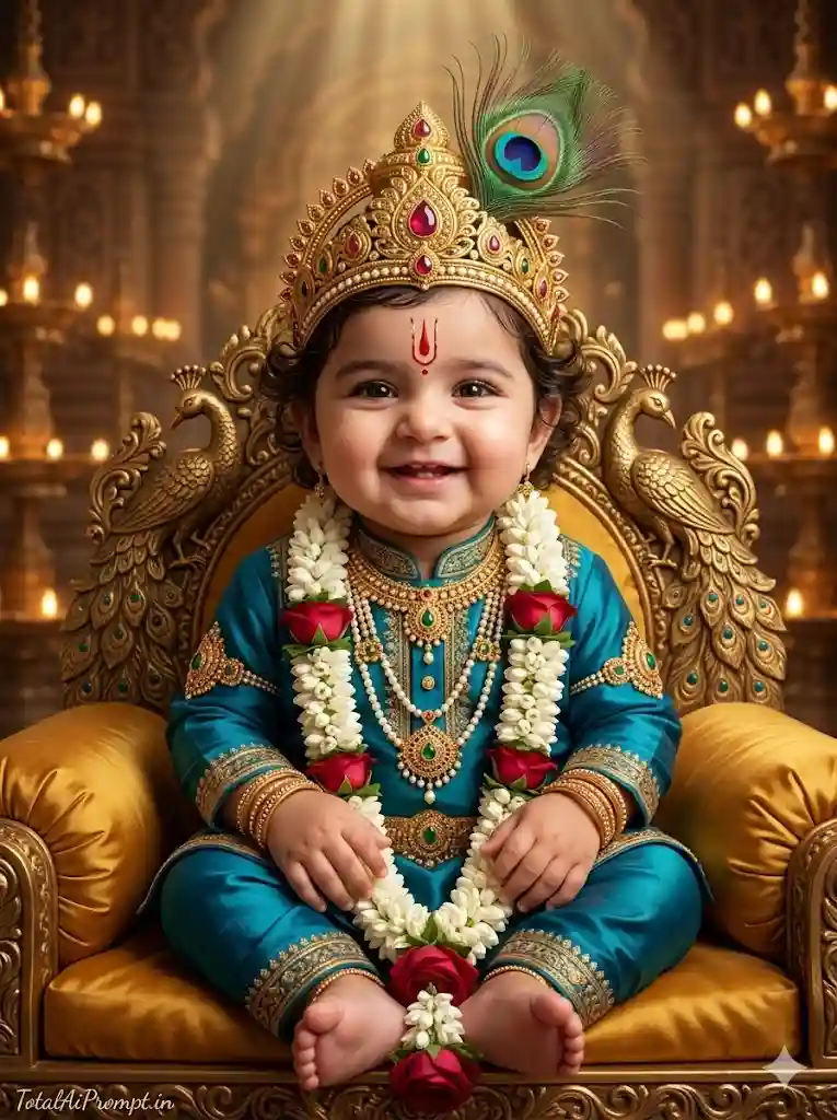 Ultra-realistic cinematic portrait of a divine infant Lord Krishna seated regally on an intricately crafted antique golden throne decorated with elegant peacock carvings, ensuring the face matches the reference [uploaded image] exactly with zero alteration, preserving authentic facial structure, proportions, expression, and skin detail. The baby has soft chubby cheeks, enchanting deep brown eyes, and a gentle innocent smile, wearing a rich teal-blue silk traditional outfit adorned with detailed gold embroidery and emerald embellishments. A magnificent golden Mukut embellished with rubies and a vibrant iridescent peacock feather rests on his head, complemented by layered gold necklaces, delicate pearl strands, ornate armbands, polished golden bangles, and a centered red sandalwood tilak on the forehead. A thick garland of fresh white jasmine and deep red roses drapes naturally around his neck while the throne is cushioned with luxurious mustard-yellow satin fabric. The background reveals a softly blurred temple interior with glowing golden diyas and intricate carvings, creating a sacred warm atmosphere. Use soft golden cinematic lighting, volumetric light rays, natural shadows, and lifelike skin textures to achieve extreme photorealistic detail with realistic fabrics, authentic materials, and rich depth as if captured with a high-end full-frame camera in 8K resolution, masterpiece quality. Maintain a vertical 3:4 aspect ratio and place the subtle signature text “TotalAiPrompt.in” at the bottom-left corner in a small thin handwritten cursive style in white or soft off-white for a premium elegant look. Negative prompts: do not alter the reference face, avoid cartoon or anime style, illustration effects, unrealistic skin smoothing, plastic textures, excessive glow, distorted anatomy, extra limbs or fingers, deformed facial features, blur, noise, low resolution, compression artifacts, incorrect lighting, oversharpening, color banding, text distortion, watermark conflicts, or unnatural background elements, ensuring balanced composition, correct perspective, and fully natural photorealistic rendering.