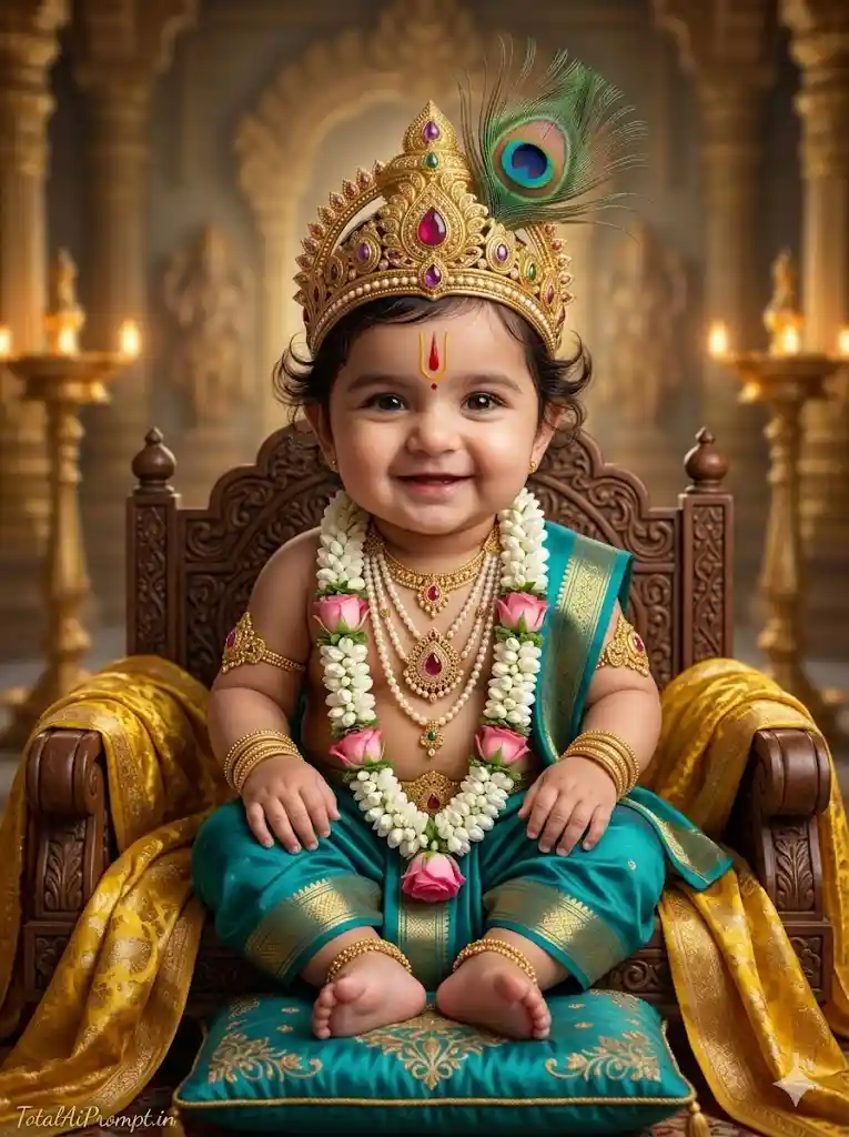 Create an ultra-realistic, cinematic full-body portrait where the face precisely matches the reference [uploaded image] with absolutely no alteration, preserving authentic facial structure, proportions, expressions, and natural skin detail. Depict a divine infant Lord Krishna seated gracefully on an intricately handcrafted wooden throne, showing a charming innocent expression with sparkling dark eyes and a soft warm complexion. He is dressed in a traditional teal and gold silk dhoti with a matching silk sash elegantly draped over one shoulder, rendered with highly detailed fabric texture and natural folds. A refined golden Mukut decorated with emerald gemstones and a single tall iridescent peacock feather crowns his head. His appearance is enriched with exquisite traditional jewelry including ornate golden armbands, layered necklaces featuring a ruby centerpiece pendant, stacked gold bangles, and delicate golden anklets. A bright red Vaishnav tilak is clearly marked on his forehead while a fragrant garland of fresh white jasmine and pink rose buds rests around his neck. The throne is draped with rich shimmering yellow brocade fabric, and near his feet lies a matching teal embroidered silk cushion. The background reveals a softly blurred grand temple hall illuminated with warm amber lighting and distant golden pillars, creating a sacred, majestic atmosphere. Use soft cinematic volumetric lighting, realistic shadows, lifelike skin texture, and precise material rendering to achieve an 8K photorealistic masterpiece with divine radiance and natural depth as if captured with a professional full-frame camera. Maintain a vertical 3:4 aspect ratio and place the subtle signature text “TotalAiPrompt.in” at the bottom-left corner in a small thin handwritten cursive style using white or soft off-white color for understated premium elegance. Negative prompts and restrictions: do not modify the reference face, avoid cartoon or anime style, illustration effects, unrealistic skin smoothing, plastic textures, excessive glow, distorted anatomy, extra limbs or fingers, deformed facial features, blur, noise, low resolution, compression artifacts, incorrect lighting, oversharpening, color banding, text distortion, watermark overlap, or unnatural background elements, ensuring balanced composition, accurate perspective, and fully lifelike photorealistic rendering.