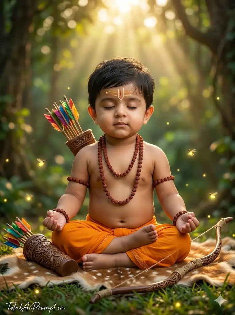Ultra-realistic, cinematic 8K vertical 3:4 portrait of a serene 3-year-old Indian boy with gentle Mini Ram meditation vibes, generated using the uploaded reference image as a strict identity lock so the face matches perfectly with zero modification, preserving exact facial structure, skin tone, expression, and natural hair texture; the child sits peacefully in a deep Padmasana (lotus) pose with eyes closed in calm meditation, featuring a traditional sandalwood tilak on the forehead, dressed in a bright saffron (bhagwa) wrap and adorned with multiple layers of sacred rudraksha bead necklaces, bracelets, and armlets rendered with highly detailed textures; beside him lies a beautifully carved wooden bow along with a traditional quiver filled with colorful feathered arrows, while he sits on a deer-skin rug placed over soft green grass and moss inside a mystical ancient forest environment with dense lush foliage; soft glowing fireflies float gently around the subject and warm ethereal sunbeams pierce through the tree canopy creating natural volumetric light rays and a dreamy bokeh background, producing a peaceful, divine, and spiritual atmosphere with lifelike shadows, realistic depth of field, natural skin tones, high dynamic range lighting, cinematic color grading, and photorealistic fabric and environment details; TEXT / SIGNATURE: place “TotalAiPrompt.in” in the bottom-left corner in a small thin handwritten cursive font in white or soft off-white; negative prompts: no face alteration, no identity change, no cartoon style, no unrealistic anatomy, no extra limbs, no distorted hands, no plastic skin, no oversharpening, no blur, no low resolution, no exaggerated glow, no duplicate subjects, no cluttered background, no incorrect lighting direction, no artifacts, no watermark except specified signature.