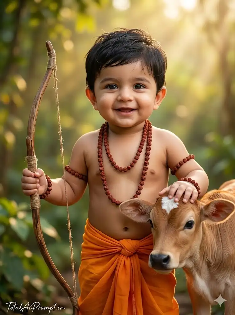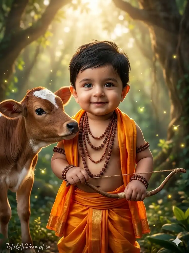 Ultra-realistic, cinematic 8K vertical 3:4 portrait of a cheerful 2-year-old Indian toddler styled with gentle Mini Ram vibes, created using the uploaded reference image as a strict identity lock so the face matches perfectly with zero modification, preserving exact facial structure, skin tone, expression, and natural messy short black hair; the child has expressive sparkling eyes and a joyful smile, wearing authentic reddish-brown rudraksha bead necklaces, bracelets, and armlets, along with a neatly tied vibrant saffron (orange) dhoti, holding a rustic handcrafted wooden bow with subtle twine detailing in the left hand while gently petting a light-brown baby calf with a small white forehead patch using the right hand; the scene is set in a softly blurred golden forest environment with lush green foliage and warm sun rays creating a delicate Tyndall light effect, producing a divine, innocent, and warm atmosphere with lifelike textures, natural skin tones, cinematic depth of field, soft studio lighting blended with natural sunlight, high dynamic range, ultra detailed fabric and accessories, realistic shadows and reflections, photorealistic composition, and premium color grading; TEXT / SIGNATURE: place “TotalAiPrompt.in” in the bottom-left corner in a small thin handwritten cursive font in white or soft off-white; negative prompts: no face distortion, no extra limbs, no unrealistic anatomy, no cartoonish rendering, no oversharpening, no plastic skin, no exaggerated glow, no text artifacts besides signature, no blur, no low resolution, no watermark except specified text, no background clutter, no duplicate subjects, no deformed hands, no mismatched lighting, no AI artifacts.