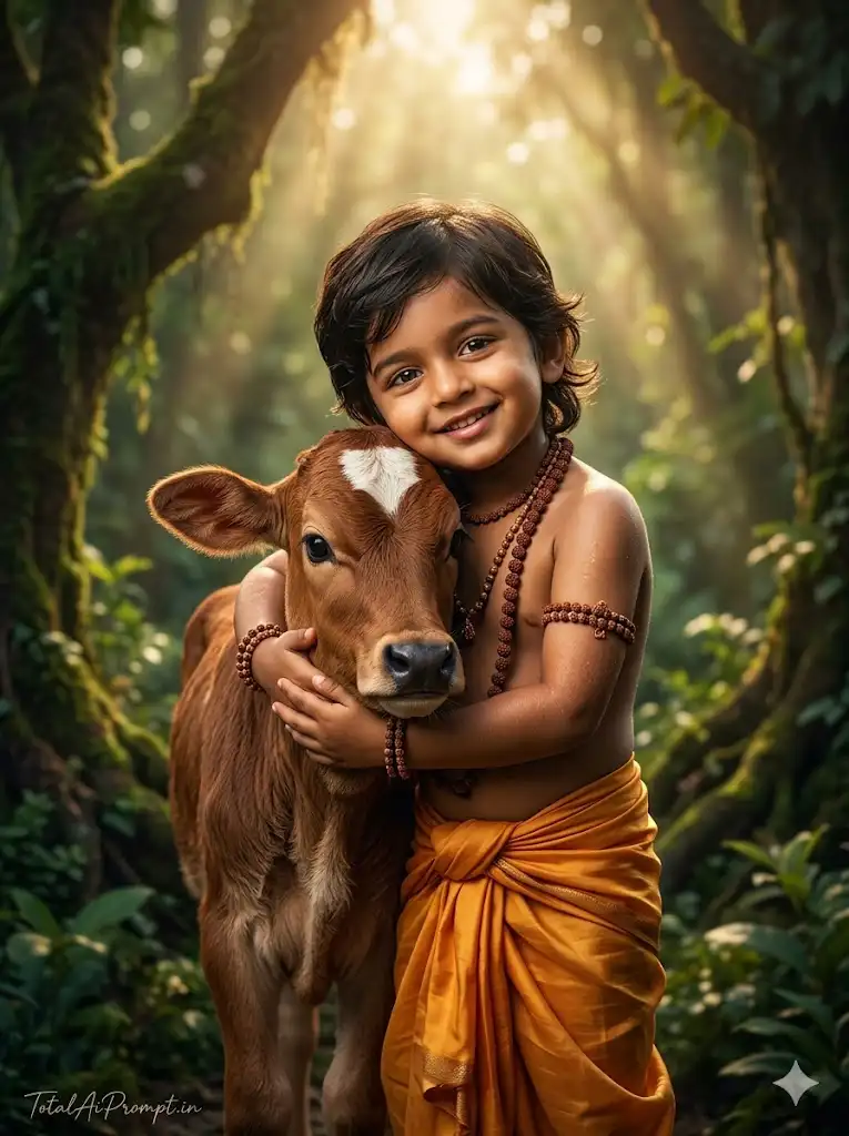 Ultra-realistic cinematic 8K vertical 3:4 portrait of a cheerful 3-year-old Indian boy styled with Bal Ram vibes, generated using the uploaded reference image as a strict identity lock so the face matches perfectly with zero modification, preserving exact facial structure, skin tone, expression, and natural hair texture; the child has radiant sun-kissed skin, sparkling expressive eyes, and a joyful smile, wearing a traditional saffron-colored silk dhoti with realistic fabric folds, tenderly embracing a small brown calf featuring a white diamond patch on its forehead, with both arms wrapped gently around the calf’s neck to convey pure divine affection, adorned with authentic rudraksha bead necklaces and bracelets on wrists and upper arms rendered with intricate detail; the environment is a mystical Vrindavan-style forest at golden hour with ancient moss-covered trees, lush greenery, soft dreamy bokeh, and warm volumetric sun rays filtering through dense foliage to create a magical glowing atmosphere, photorealistic skin texture, soft calf fur detail, cinematic depth of field, shot on 85mm lens look with shallow focus, high dynamic range lighting, natural shadows, and vibrant yet earthy color grading for masterpiece quality; TEXT / SIGNATURE: place “TotalAiPrompt.in” at the bottom-left corner in a small thin handwritten cursive font in white or soft off-white; negative prompts: no face alteration, no identity change, no cartoon style, no unrealistic anatomy, no extra limbs, no distorted hands, no plastic skin, no overexposure, no blur, no low resolution, no duplicate subjects, no incorrect lighting, no artifacts, no watermark except specified signature, no exaggerated glow, no background clutter.