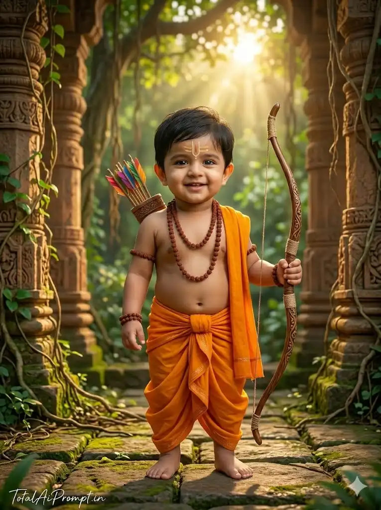 Ultra-realistic cinematic 8K full-body portrait in a vertical 3:4 aspect ratio of a cheerful Indian toddler styled with gentle Mini Ram mythological vibes, created using the uploaded reference image as a strict identity lock so the face matches perfectly with zero modification, preserving exact facial structure, skin tone, expression, and natural short black hair; the child has sparkling eyes and a joyful smile with a sacred sandalwood U-shaped tilak on the forehead, standing barefoot on moss-covered ancient stone pavers within a historic temple ruin environment, adorned with multiple layers of detailed rudraksha bead necklaces, bracelets, and an armlet, wearing a meticulously draped bright saffron (orange) dhoti with a matching stole rendered with realistic fabric folds; in the left hand he holds a traditional handcrafted wooden bow with natural wood grain texture, framed by large intricately carved sandstone pillars partially covered in green vines and roots, surrounded by a lush banyan forest with warm golden-hour sunlight filtering through leaves, creating volumetric light rays, soft shadows, natural depth of field, and a divine cinematic atmosphere with photorealistic textures, lifelike lighting, high dynamic range, and premium color grading; TEXT / SIGNATURE: place “TotalAiPrompt.in” at the bottom-left corner in a small thin handwritten cursive font in white or soft off-white; negative prompts: no face change, no identity alteration, no cartoonish rendering, no extra limbs, no distorted anatomy, no unrealistic skin, no oversaturated colors, no blur, no low resolution, no duplicate subjects, no incorrect shadows, no background clutter, no AI artifacts, no watermark except specified signature.