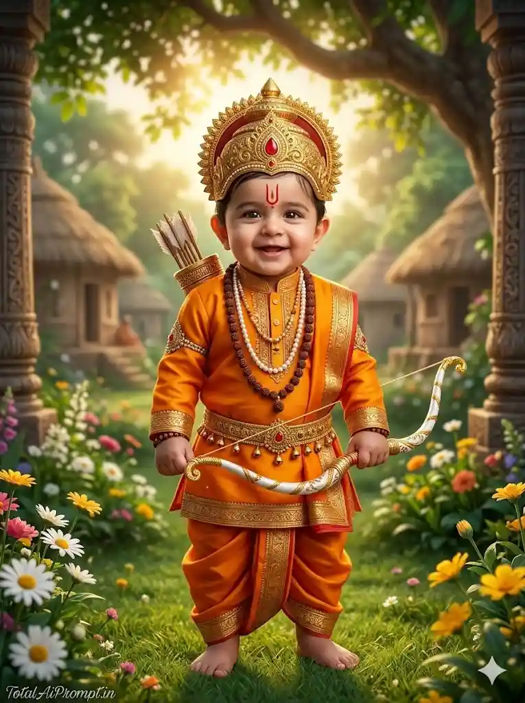Ultra-realistic, cinematic 8K vertical 3:4 portrait of an adorable toddler, using the uploaded reference image as a strict identity lock so the face, expression, and features match perfectly with zero modification; dressed as the Hindu deity Lord Rama in vibrant saffron/orange traditional Indian attire, including a richly embroidered kurta and dhoti with intricate gold borders, ornate golden crown with a red jewel, multiple necklaces of brown rudraksha beads and white pearls, a golden waist belt with small bells, and a small quiver of arrows on the back while holding a decorative white-and-gold bow; big expressive eyes looking slightly upward, red ‘U’ shaped tilak on the forehead, barefoot on soft green grass in a lush, magical garden filled with colorful flowers such as white daisies and yellow blossoms; background softly blurred to reveal a serene, ancient village scene with thatched-roof huts, carved stone pillars, and a large tree canopy; warm, glowing sunlight filters through the leaves, creating a divine, cinematic, enchanting atmosphere with photorealistic textures, natural shadows, and depth of field, hyper-detailed rendering of skin, hair, clothing, and accessories, maintaining full lifelike fidelity; TEXT / SIGNATURE: place “TotalAiPrompt.in” at the bottom-left corner in a small thin handwritten cursive font in white or soft off-white color with subtle premium elegance; negative prompts: cartoon, anime, low resolution, blur, pixelation, oversharpening, unrealistic skin, plastic texture, distorted anatomy, identity mismatch, face alteration, extra fingers, floating objects, bad perspective, lens distortion, oversaturated colors, noisy background, motion blur on face, overexposed highlights, compression artifacts, or any alteration to the original facial identity.