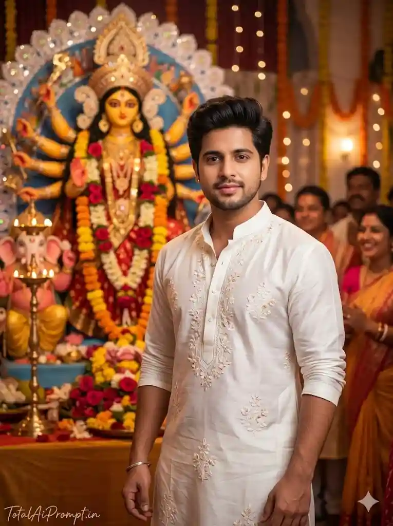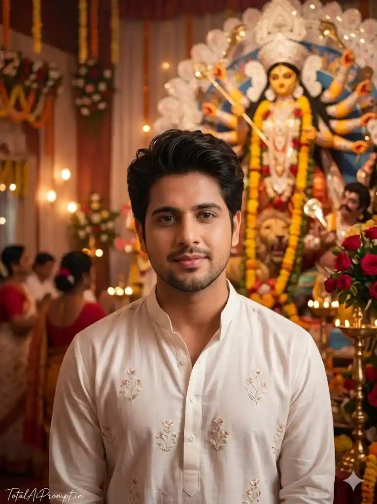 Create an ultra-realistic, cinematic 4K image of the uploaded reference [male], ensuring his facial features exactly match the reference with zero alterations. He stands gracefully in a festive Durga Puja or Navratri setting, wearing a crisp white kurta with elegant floral embroidery, minimal accessories such as a silver bracelet and subtle earrings, captured in a relaxed, confident pose with a soft smile. Behind him, a majestic Goddess Durga idol is adorned with marigolds, roses, oil lamps, and softly glowing lights, exuding a devotional and celebratory atmosphere. The background shows blurred worshippers and festival decorations, adding depth and authentic festival energy. Warm, cinematic lighting highlights his skin, clothing textures, and surrounding decorations, with DSLR-style shallow depth of field to keep the subject crisp and the background softly blurred. Maintain vertical 3:4 aspect ratio, balanced composition, and natural, lifelike details. Include the text “TotalAiPrompt.in” in the bottom-left corner in a small, thin handwritten cursive font, soft white or off-white. Negative prompts: distorted face, extra limbs, blur, low resolution, cartoonish effects, oversharpening, unrealistic textures, bad anatomy, artifacts, oversaturated colors, unnatural lighting.