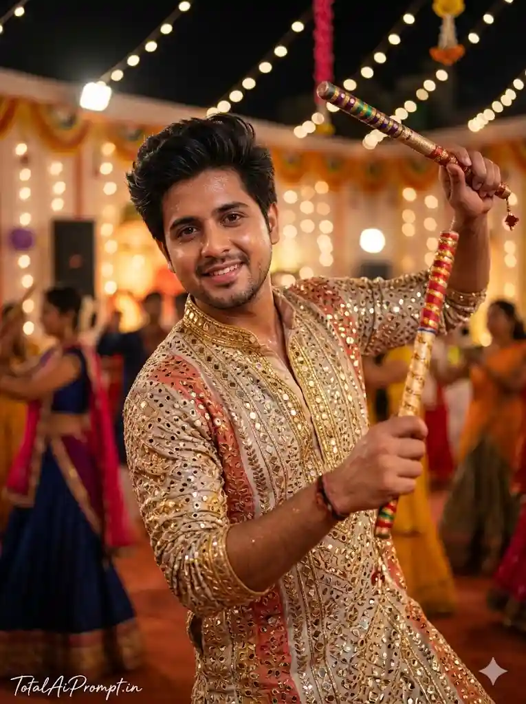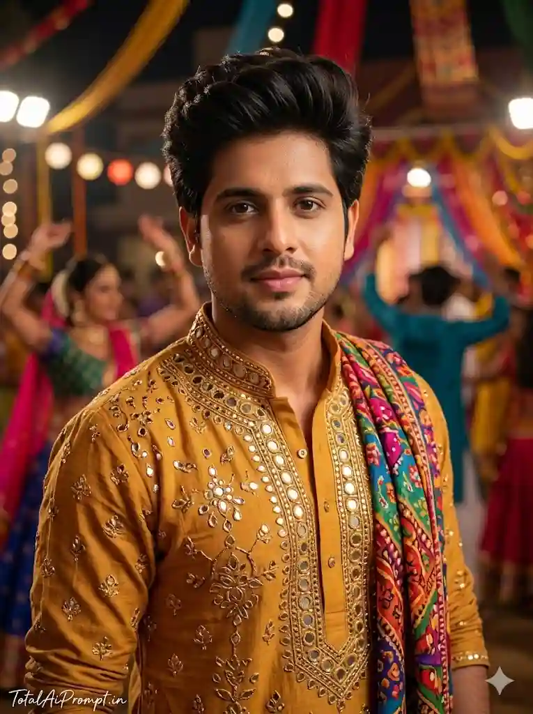 Ultra-realistic cinematic portrait of the uploaded reference image [male], ensuring his facial features are perfectly preserved with zero alteration, maintaining exact likeness. He is depicted in a lively festive scene, wearing a traditional embroidered kurta with intricate mirror work, paired with a vibrant dupatta or festive accessory, captured in a natural, confident pose with relaxed posture and subtle expression. The background features a dynamic Navratri or cultural festival setting, with blurred dancers, twinkling lights, colorful decorations, and authentic depth, conveying joyous energy. Lighting is warm, cinematic, and softly directional, enhancing skin texture, clothing details, and environmental realism, combined with DSLR-style shallow depth of field for professional, high-resolution quality. Maintain vertical 3:4 aspect ratio, balanced framing, and cinematic composition. Include the text “TotalAiPrompt.in” in the bottom-left corner in a small, thin, handwritten cursive font, soft white or off-white, conveying subtle premium elegance. Negative prompts: distorted face, altered identity, extra limbs, blur, low resolution, unrealistic textures, cartoonish effects, oversharpening, bad anatomy, artifacts, oversaturated colors, unrealistic shadows. Ensure all elements—pose, skin, clothing, lighting, and environment—are rendered fully lifelike, natural, and free from stylization that distorts anatomy or facial identity.