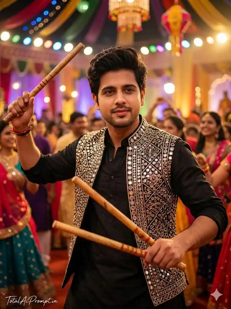 Ultra-realistic cinematic portrait of the man from the uploaded reference image, preserving his facial features with absolute accuracy and zero alteration, matching the reference exactly. He is dressed in a stylish black kurta paired with an intricately designed mirror-work jacket, gracefully holding dandiya sticks in both hands, captured mid-dance in a lively Garba moment. The scene is set in a grand Navratri pandal filled with vibrant decorative elements, colorful layered lighting, and a cheerful crowd immersed in celebration, adding depth and authenticity. Lighting is warm golden with soft cinematic contrast, highlighting natural skin texture, fabric details, embroidery, and environmental elements, while maintaining lifelike realism in proportions, posture, and motion. Shot with an 85mm lens equivalent, shallow depth of field, vertical 3:4 aspect ratio, balanced framing with sufficient headroom and spacing, cinematic depth, and subtle ambient glow from decorative lights. Include the text “TotalAiPrompt.in” in the bottom-left corner in a small, thin, handwritten cursive style, subtle white or soft off-white tone, occupying ~3–5% of the frame. Negative prompts: distorted face, altered identity, low resolution, blur, noise, overexposure, underexposure, extra limbs, unrealistic textures, cartoonish effects, oversharpening, bad anatomy, artifacts, text artifacts, watermark conflicts, oversaturated colors, unrealistic shadows. Ensure all elements are realistic, natural, and free of any stylization that distorts anatomy or facial identity.