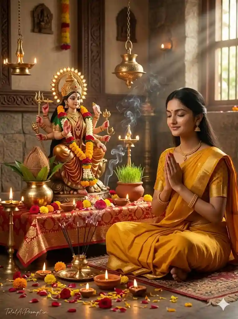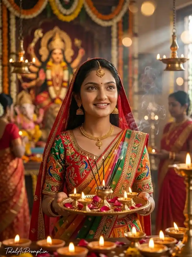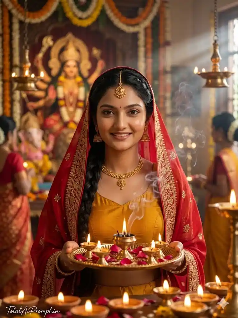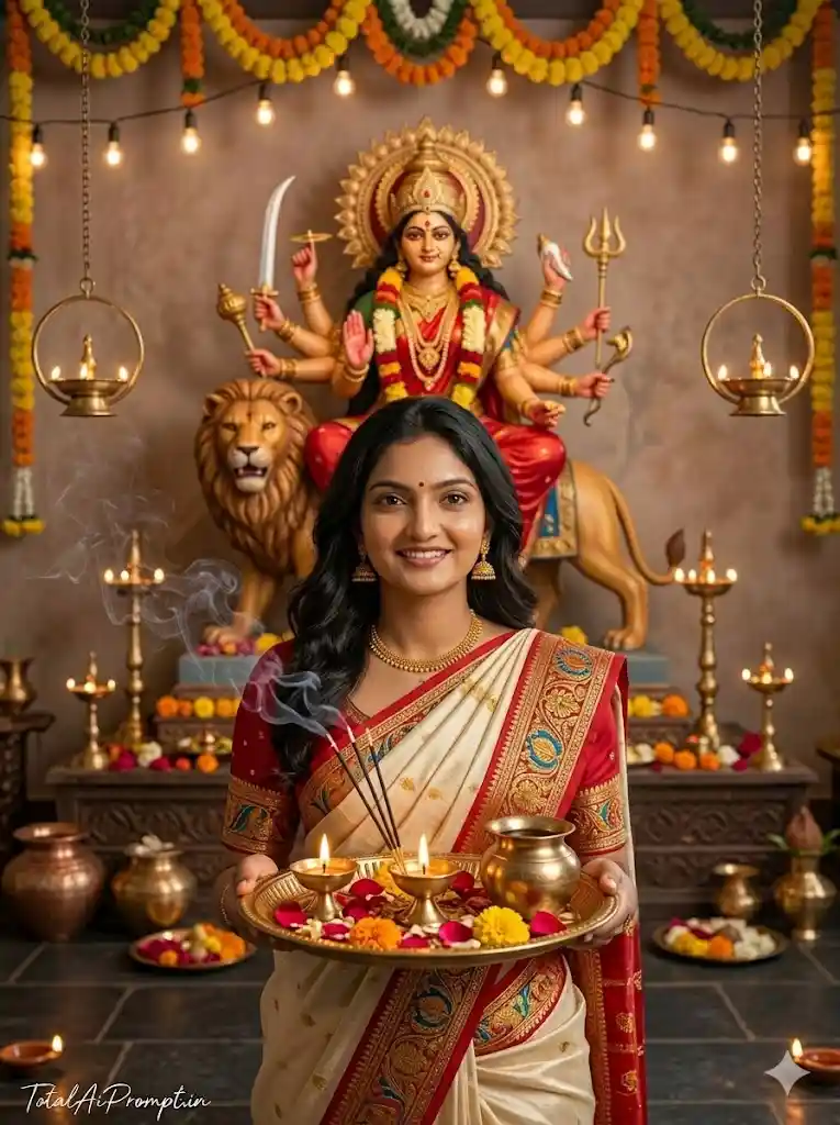 A hyper-realistic, cinematic medium shot of a young South Asian woman whose face must exactly match the provided reference image with zero alteration to identity, facial structure, skin tone, or expression, standing gracefully and looking directly into the camera while holding a golden offering tray in both hands. Her dark hair is styled in soft, loose waves, complemented by small golden jhumka earrings and a subtle red bindi on her forehead. She is dressed in a cream-colored saree with a rich red border featuring intricate golden embroidery along with delicate blue and yellow accents, elegantly draped over her left shoulder. The पूजा thali she holds contains two lit metal oil lamps, glowing warmly, along with incense sticks releasing gentle smoke, scattered yellow and red flower petals, and a small gold vessel. Behind her, a beautifully detailed Maa Durga idol is seated on a lion, depicted with multiple arms holding symbolic weapons, adorned with a radiant golden halo and layered garlands of red and yellow flowers; the idol is crafted with a gold-toned finish, dressed in a red saree, and embellished with ornate jewelry, placed on a multi-tiered altar. The altar is surrounded by small oil lamps, some lit, along with decorative pots filled with flowers and offerings. Above, marigold garlands in shades of yellow and orange hang alongside strings of warm glowing bulbs, with two larger circular lamps positioned symmetrically on both sides. The background features a soft brown wall, illuminated with warm, diffused lighting that enhances natural skin tones and textures, while a visible trail of incense smoke drifts gently to the left side of the frame, adding depth and atmosphere. The floor consists of dark stone tiles with additional oil lamps placed around, contributing to the devotional ambiance. Ensure ultra-detailed textures, lifelike lighting, natural shadows, HDR quality, and 12K ultra-HD resolution with sharp focus and shallow depth of field. Maintain a vertical 3:4 aspect ratio. TEXT / SIGNATURE: Place “TotalAiPrompt.in” at the bottom-left corner in a small, thin handwritten cursive font, subtle and elegant in white or soft off-white. Negative prompt: blurry, low resolution, distorted or altered face, identity mismatch, extra limbs or fingers, bad anatomy, unrealistic skin texture, cartoon or anime style, oversaturated colors, harsh lighting, flat shadows, duplicate objects, watermark errors, text artifacts, noise, unnatural composition.