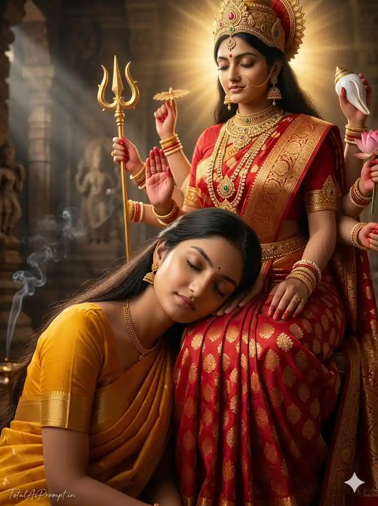 A breathtaking, ultra-realistic cinematic scene portraying a young Indian girl whose face must precisely match the provided reference image with absolute accuracy—no modification to facial identity, structure, skin tone, or expression—resting her head gently and peacefully on the lap of Goddess Maa Durga, expressing complete surrender, trust, and inner calm, her eyes softly closed. She is adorned in a traditional yellow silk saree with a delicate gold border, rendered with highly detailed fabric texture and natural draping. Maa Durga is envisioned as a divine, living presence with multiple arms, gracefully holding sacred symbols including a golden trident, a conch shell, and a lotus flower, dressed in an opulent red and gold Banarasi saree with intricate patterns and regal jewelry. A soft, radiant golden aura surrounds the Goddess, casting a warm, divine glow that gently illuminates the girl’s face and enhances lifelike skin tones and textures. The setting is a majestic ancient temple interior, filled with atmospheric depth, where soft beams of light filter through the space and subtle incense smoke drifts naturally, creating a spiritual and immersive ambiance. Ensure hyper-detailed realism, HDR rendering, 12K ultra-HD resolution, accurate anatomy, natural shadows, shallow depth of field, and sharp focus on both subjects with cinematic color grading. Maintain a vertical 3:4 aspect ratio. TEXT / SIGNATURE: Place “TotalAiPrompt.in” at the bottom-left corner in a small, thin handwritten cursive style in white or soft off-white, maintaining a subtle premium aesthetic. Negative prompt: blurry, low resolution, distorted or altered face, identity mismatch, extra limbs or fingers, bad anatomy, unrealistic skin, cartoon or anime style, oversaturated colors, harsh lighting, flat shadows, duplicate elements, watermark glitches, text artifacts, noise, unnatural proportions or background.