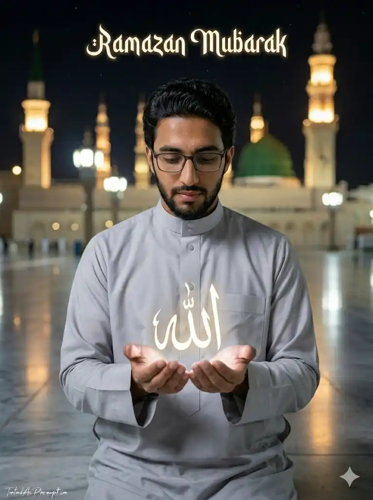 Create an ultra-realistic cinematic waist-up portrait in a vertical 3:4 aspect ratio, ensuring the subject’s face perfectly matches the provided reference image with zero modification, preserving exact facial identity, skin tone, structure, and expression. Depict a young, stylish South Asian man with dark wavy hair, a neatly trimmed beard, and clear-rimmed glasses, wearing a refined light grey thobe, standing calmly with a serene and contemplative expression while looking slightly downward. His hands are gently held open in front of him, palms upward, from which a softly glowing white Arabic calligraphy of “Allah” radiates a subtle spiritual light that illuminates his fingers and the folds of his thobe with natural highlights and reflections. The background features a beautifully blurred night view of Masjid an-Nabawi, with the iconic Green Dome and softly glowing minarets rendered as warm golden bokeh lights beneath a deep night sky. The overall atmosphere should feel peaceful, reverent, and spiritual, with natural warm lighting and a gentle ethereal glow emanating from the calligraphy. Maintain extremely sharp focus on the man’s face, hands, and the glowing Arabic text while the mosque background remains softly blurred with smooth cinematic bokeh created by a shallow depth of field. Render lifelike details including realistic skin texture, beard hair strands, crisp fabric folds of the thobe, and natural light falloff for a professional photographic appearance as if captured using a Canon EOS R5 with an 85mm lens, f/1.8 aperture, 1/160 sec shutter speed, ISO 800, featuring natural color grading, high dynamic range, and subtle cinematic depth. At the top center add the text “RAMAZAN MUBARAK” in elegant Islamic or Arabic-style calligraphy, colored soft gold or white with a delicate glow so it blends harmoniously with the night scene. Place the signature “TotalAiPrompt.in” at the bottom-left corner in a small thin handwritten cursive style using white or soft off-white for subtle premium branding. Negative prompts / restrictions: no face alteration, no identity mismatch, no distorted anatomy, no extra limbs or fingers, no malformed hands, no blur on subject, no low resolution, no plastic skin effect, no oversharpening, no oversaturated colors, no cartoon or illustration style, no duplicate faces, no warped perspective, no incorrect lighting direction, no artifacts, no text distortion, and no watermark overlap.