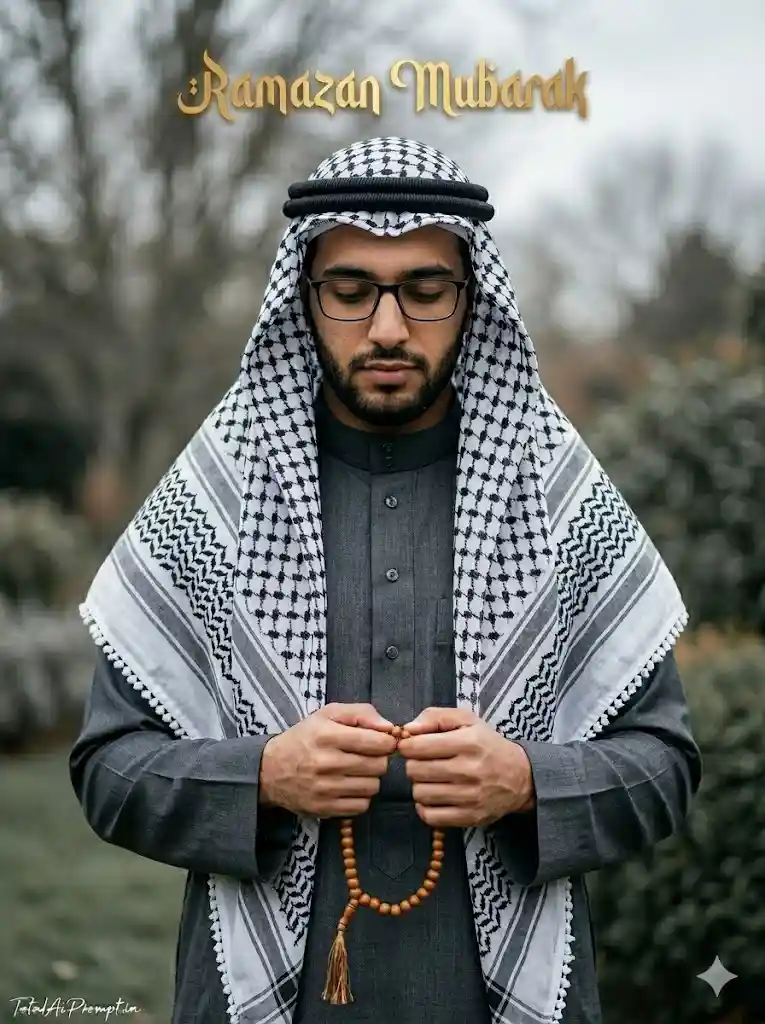 Produce an ultra-realistic cinematic portrait in a vertical 3:4 aspect ratio where the subject’s face matches the provided reference image exactly with zero modification, preserving identical identity, facial structure, skin tone, and expression. Depict a young scholarly Muslim man of Middle Eastern appearance with short dark hair, a neatly trimmed beard, and classic square black-rimmed glasses, gently looking downward in a calm moment of spiritual reflection. He is dressed in a refined dark-grey textured thobe (jubbah) with a buttoned collar, while a neatly arranged black-and-white keffiyeh (shemagh) with a detailed Palestinian-style geometric pattern is draped over his head and shoulders. His hands rest together at his waist while he thoughtfully counts a strand of large warm-brown wooden misbaha (prayer beads) with a simple tassel hanging downward. Place him in a softly blurred outdoor natural setting featuring muted grey-green tones and smooth bokeh suggesting trees or bushes on a cloudy day, with gentle diffused daylight creating soft even illumination and realistic shadows. The focus should remain extremely sharp on his face, glasses, hands, and prayer beads while the background fades naturally using a shallow depth of field. Render highly detailed textures in the keffiyeh fabric, thobe material, skin pores, beard hair, and wooden beads to achieve lifelike photographic realism. Apply cinematic yet natural color grading with subtle film grain, resembling a professional photograph captured on a high-end mirrorless camera such as a Canon EOS R5 with f/2.8 aperture, 1/160 sec shutter speed, ISO 200, maintaining a respectful, serene, and spiritual mood. At the top center of the image place the text “RAMZAN MUBARAK” in elegant Islamic or Arabic-inspired calligraphy, colored soft gold or clean white with a very subtle glow so it blends harmoniously with the scene. Add the signature “TotalAiPrompt.in” in the bottom-left corner using a very small, thin handwritten cursive font in white or soft off-white for understated premium branding. Negative prompts / restrictions: no face alteration, no identity mismatch, no unrealistic skin smoothing, no plastic skin, no distorted anatomy, no extra fingers, no malformed hands, no incorrect proportions, no blur on the subject, no low resolution, no oversaturation, no cartoon or illustration style, no duplicate faces, no warped perspective, no harsh artificial lighting, no text distortion, no misplaced watermark, and no visual artifacts that reduce realism.