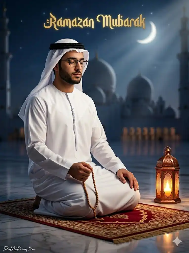 Create a single ultra-realistic cinematic image in a vertical 3:4 aspect ratio where the subject’s face matches the provided reference image exactly with zero modification, preserving identical facial structure, skin tone, expression, and identity with perfect realism. Depict a young Middle Eastern man wearing glasses, dressed in a pristine white Thobe and traditional Ghutra secured with an Agal, peacefully seated in the Islamic Tashahhud prayer posture on an ornate crimson and gold patterned prayer rug. He gently holds a traditional wooden Tasbih (prayer beads) while his eyes remain softly closed, expressing deep spiritual reflection and calm devotion. Beside him place a beautifully crafted glowing copper lantern emitting a warm flickering amber light that softly illuminates his face, clothing folds, and the polished marble floor with natural reflections and shadows. In the background include the majestic silhouette of a grand mosque with multiple domes and tall minarets rendered in soft focus under a deep indigo night sky. A bright glowing crescent moon should appear clearly in the upper sky, enhancing the peaceful Ramadan atmosphere while subtle volumetric light rays and cinematic depth of field add a tranquil, ethereal mood. At the top center of the image write “Ramazan Mubarak” in elegant Islamic calligraphy style, soft gold or white color with a gentle glow so it blends beautifully with the night sky. Render the entire composition with lifelike textures, natural skin detail, accurate fabric folds, physically correct lighting, shallow depth of field, and 8K ultra-high-definition cinematic quality. Place the small signature “TotalAiPrompt.in” at the bottom-left corner in a thin handwritten cursive font in white or soft off-white to give a subtle premium feel. Negative prompts / restrictions: no face change, no identity alteration, no unrealistic skin smoothing, no extra fingers, no deformed hands, no distorted anatomy, no incorrect body proportions, no blur, no low resolution, no plastic skin, no oversaturation, no cartoon or illustration style, no duplicate faces, no warped perspective, no messy background artifacts, no watermark overlap, no incorrect text placement, and no unrealistic lighting effects.