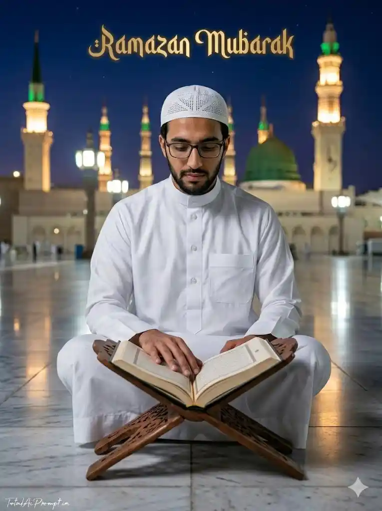 Create an ultra-realistic cinematic wide shot in a vertical 3:4 aspect ratio, ensuring the subject’s face perfectly matches the provided reference image with zero modification, preserving the exact facial structure, identity, skin tone, and expression. Show a young Middle Eastern man wearing glasses, dressed in a pristine white Thobe and a traditional white embroidered Kufi (prayer cap), seated cross-legged in a calm, respectful posture on the polished marble courtyard floor while reading the Holy Quran placed on an intricately carved wooden Rehal (book stand), with his hands gently resting on the open pages. The setting is the sacred courtyard of Masjid an-Nabawi at night, where the iconic Green Dome and illuminated minarets appear softly blurred in the background beneath a deep indigo night sky with faint stars. The marble floor reflects the soft mosque lights, producing warm highlights and subtle reflections that enhance the peaceful spiritual mood. Maintain extremely sharp focus on the man, the Quran, and the carved wooden stand while the mosque background fades into smooth cinematic bokeh with a shallow depth of field. Render lifelike textures including detailed skin pores, natural beard detail, crisp thobe fabric folds, and realistic wood grain on the Rehal, achieving a professional photographic look as if captured with an 85mm lens at f/1.8 in 8K Ultra-HD quality with natural color grading and cinematic lighting. At the top center of the image write “RAMAZAN MUBARAK” in elegant Islamic or Arabic-style calligraphy, colored soft gold or white with a gentle glow or soft light so it harmonizes with the night sky and crescent ambiance. Place the signature “TotalAiPrompt.in” at the bottom-left corner in a small thin Kaushan Script handwritten style using white or soft off-white for subtle premium branding. Negative prompts / restrictions: no face alteration, no identity mismatch, no distorted anatomy, no extra limbs or fingers, no malformed hands, no blur on subject, no low resolution, no plastic skin, no oversaturation, no cartoon or illustration style, no duplicate faces, no warped perspective, no artifacts, no incorrect lighting direction, no text distortion, and no watermark overlap.