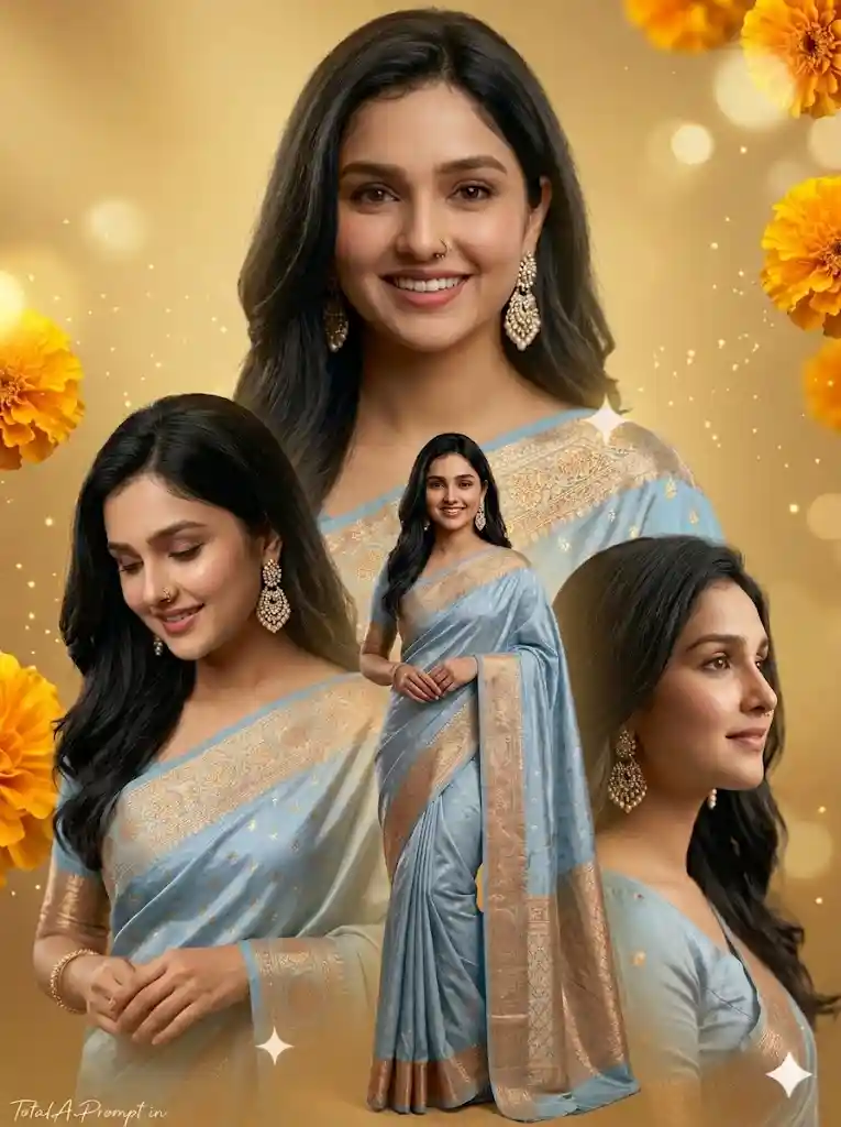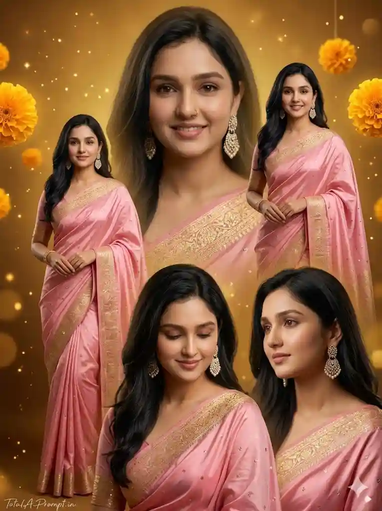 Generate an ultra-realistic, cinematic-quality vertical (3:4) greeting card collage featuring Smita, ensuring her face precisely matches the uploaded reference image with absolutely no alteration to facial structure, expression, or identity. She is dressed in a rich sky-pink silk saree adorned with intricate zari work and subtle sparkling highlights, rendered with lifelike texture and fabric depth. Compose a refined collage layout on a warm golden gradient background, incorporating multiple overlapping poses: a primary soft-smiling portrait at the top center, a gentle downward-looking pose, a full-length standing pose, and a dreamy side profile, all seamlessly blended. Enhance the composition with softly glowing marigold flowers, delicate sparkles, bokeh effects, and cinematic golden lighting that appears natural and immersive, with realistic skin tones, shadows, and depth of field. Maintain photographic authenticity in every detail, avoiding any artificial or exaggerated elements. Add the text “TotalAiPrompt.in” in the bottom-left corner in a small, thin, handwritten cursive style, using white or soft off-white color for a subtle premium feel. Negative prompts: no face distortion, no change in identity, no asymmetry, no extra limbs or duplicate faces, no blur, no overexposure, no harsh shadows, no cartoonish or painterly effects, no unrealistic lighting, no artifacts, no low resolution, no watermark other than specified text, no text deformation, no color banding, no incorrect anatomy, no background inconsistencies.