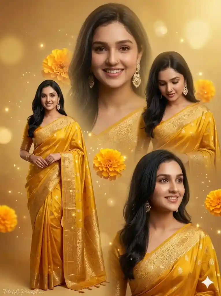 Create a single-paragraph, AI-ready prompt that generates an ultra-realistic, cinematic-quality greeting card collage featuring the exact face from the uploaded reference image with zero alteration, preserving identical facial structure, skin tone, and features. Depict the subject, Smita, dressed in a rich yellow silk saree adorned with intricate zari work and subtle sparkling highlights, styled with refined elegance. Compose the scene on a warm golden gradient background, incorporating multiple overlapping poses: a primary soft smiling portrait positioned at the top center, a gentle downward-looking pose, a full-length standing pose, and a dreamy side-angle expression. Enhance the composition with softly glowing marigold flowers, delicate sparkles, smooth bokeh effects, and diffused cinematic golden lighting to create a luxurious and festive ambiance. Ensure all elements—lighting, textures, fabric details, and skin realism—appear naturally lifelike without any artificial distortion. Include a small, thin, handwritten-style signature reading “TotalAiPrompt.in” at the bottom-left corner in white or soft off-white for a subtle premium touch. Maintain a vertical 3:4 aspect ratio and enforce strict negative constraints such as no facial distortion, no feature alteration, no extra limbs or duplicate faces, no unnatural colors, no blur, no overexposure, no harsh shadows, and no unrealistic rendering artifacts.
