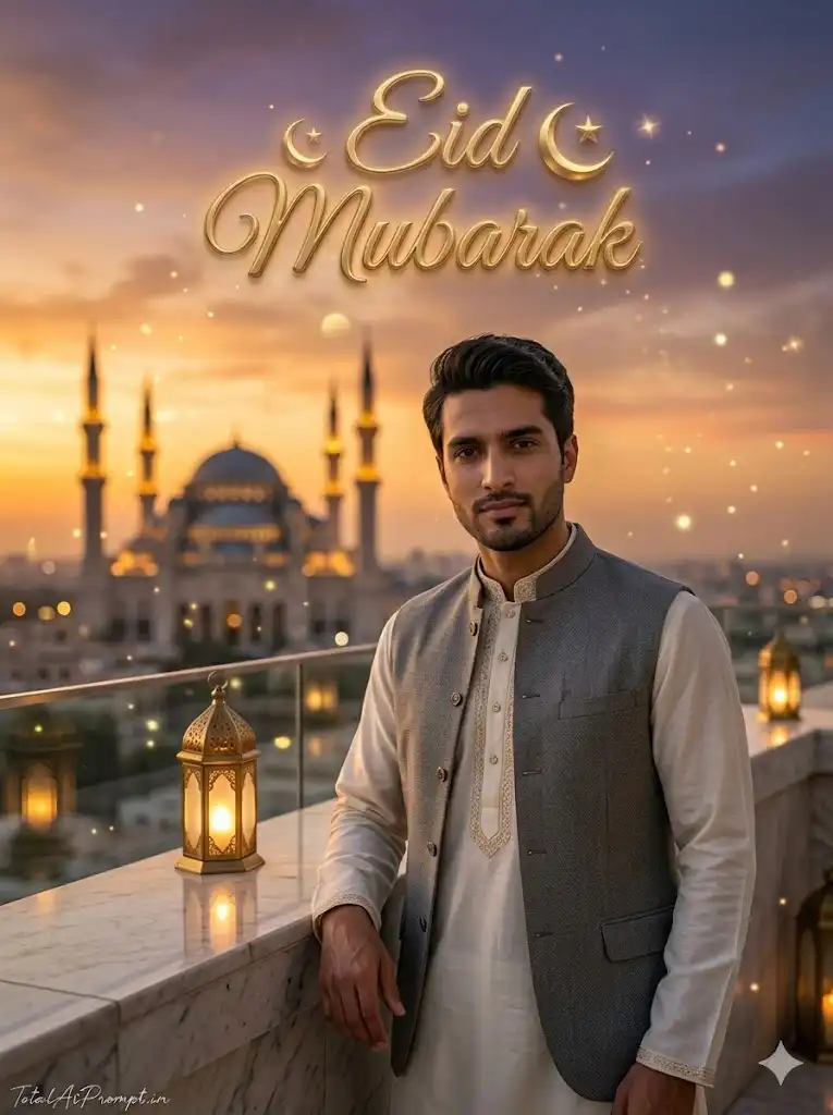 Create an ultra-realistic cinematic Eid Mubarak portrait using the uploaded reference image, ensuring the subject’s face is reproduced exactly as in the reference with zero modification, preserving true facial structure, proportions, identity, skin tone, and expression while maintaining natural pores and lifelike skin texture. The composition features a stylish Muslim man standing confidently in an elegant modern terrace setting during golden-hour sunset, wearing a premium ivory-white kurta with subtle golden embroidery and a tailored modern waistcoat, conveying a refined festive look. Behind him, the environment reveals a beautiful panoramic city skyline with a grand mosque silhouette in the distance featuring glowing minarets and a large dome, softly blurred through cinematic shallow depth of field to keep the focus on the subject. The sky is filled with rich sunset colors—warm gold, amber, peach, and deep violet tones—creating a luxurious festive atmosphere, while soft cinematic lighting illuminates his face from the side, producing gentle shadows and highlighting realistic skin texture and fabric details. Around the scene, add subtle floating golden light particles and soft festive sparkles, along with two elegant glowing Islamic lanterns placed on a marble ledge nearby, enhancing the premium Eid ambiance. In the upper sky area, include large creative 3D golden calligraphy text reading “Eid Mubarak”, designed with luxurious embossed metallic depth, delicate shine, soft glowing edges, and natural shadows, subtly integrated with small crescent moon and star elements so the typography blends naturally with the sunset sky without overpowering the portrait. Ensure professional photography composition, ultra-high detail, crisp focus, realistic reflections, cinematic color grading, soft shadows, and a rich festive atmosphere. Strictly enforce realism constraints: no facial alteration, no beautification, no reshaping, no identity change, no extra limbs or fingers, no distorted anatomy, no plastic skin, no blur, no noise artifacts, no cartoon or anime styling, no duplicate features, and no unrealistic lighting. Add a small, thin handwritten cursive signature “TotalAiPrompt.in” in white or soft off-white color at the bottom-left corner, subtle and premium. Render in Ultra HD 4K quality with cinematic clarity and professional portrait detail, maintaining a vertical 3:4 aspect ratio for the final composition.