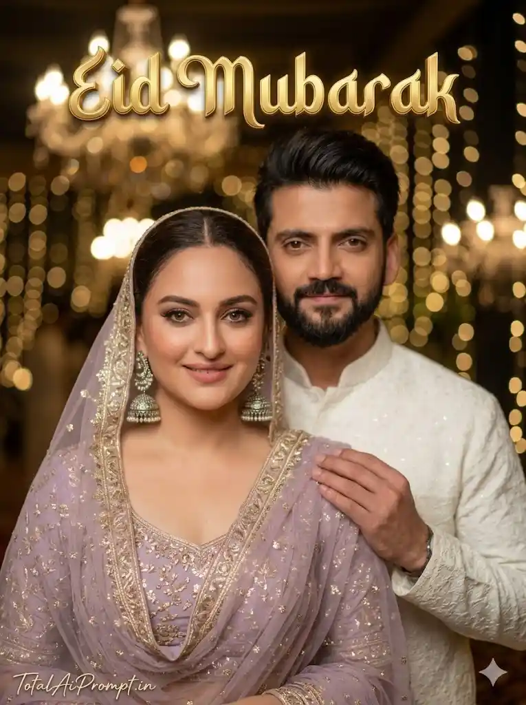 Create an ultra-realistic, cinematic portrait strictly matching the reference image (uploaded image) with the face reproduced exactly as provided, without any alteration, modification, or reinterpretation, ensuring complete identity preservation and lifelike accuracy. The scene portrays a romantic Muslim couple during a festive night setting, illuminated by warm fairy-light bokeh and elegant chandelier lighting that casts a soft cinematic glow across the frame, producing natural highlights, gentle shadows, and a premium photographic atmosphere. The woman appears in the foreground wearing a lavender traditional outfit richly decorated with intricate embroidery and a gracefully draped matching dupatta, complemented by heavy silver jhumka earrings, subtle natural makeup, and a soft, pleasant smile; behind her stands the man in a refined white kurta, neatly groomed beard, and stylish haircut, gently holding the edge of her dupatta in a respectful and affectionate pose. The environment should feel luxurious and celebratory, captured in professional photography style with sharp focus, ultra-fine texture detail, vibrant yet balanced colors, and true-to-life skin tones rendered in 8K quality. Add large glossy 3D text reading “Eid Mubarak” near the top center beside the couple, designed in golden metallic Islamic decorative typography with a subtle glow, realistic reflections, and depth shadows to create an elegant premium festival aesthetic. Place the small signature “TotalAiPrompt.in” at the bottom-left corner in a thin handwritten cursive style, colored white or soft off-white to maintain subtle sophistication. Maintain a vertical 3:4 aspect ratio and ensure the entire composition appears naturally photographed rather than digitally exaggerated. Negative prompts: distorted or altered faces, identity changes, asymmetry, extra limbs or fingers, unnatural body proportions, plastic or overly smooth skin, excessive HDR, oversharpening, blur, noise, low resolution, color banding, incorrect lighting direction, unrealistic reflections, cartoon or anime style, duplicate subjects, watermark artifacts (except the specified signature), text glitches, compression artifacts, and any visual element that reduces realism.