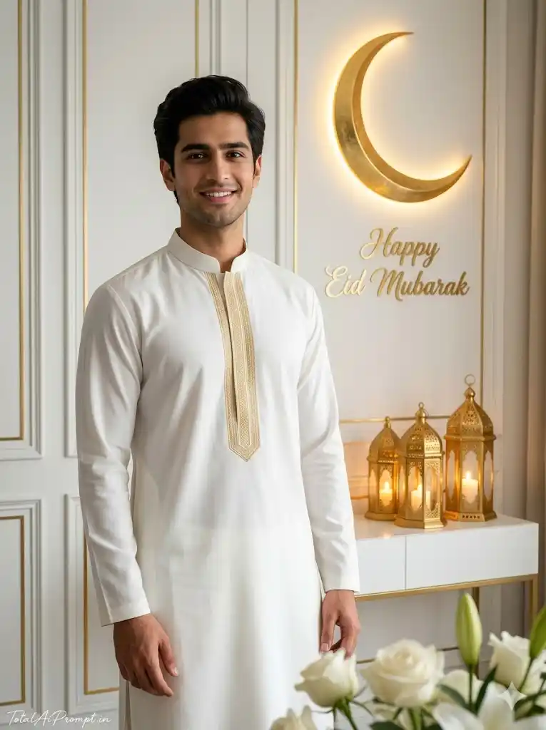 Create an ultra-realistic, cinematic Eid Mubarak luxury portrait generated from a reference image, where the subject’s face must match the uploaded photo exactly with zero alteration, preserving true facial structure, identity, expression, skin tone, and proportions while maintaining highly detailed natural skin texture and lifelike realism. The scene features a handsome young man wearing an elegant white traditional kurta with a subtle golden embroidered strip running vertically, standing confidently in a modern white interior room decorated with refined wall panels. Behind him, include a glowing golden crescent moon wall décor emitting a soft warm halo, and beneath it place elegant golden “Happy Eid Mubarak” calligraphy text on the wall. On one side, arrange three decorative golden Islamic lanterns (fanous) on a minimal white console table, softly glowing with warm light, while soft white flowers appear slightly blurred in the foreground to enhance a premium festive composition. The overall aesthetic should follow a royal white-and-gold color palette, minimal, luxurious, and celebratory, with soft cinematic lighting, gentle shadows, shallow depth of field, crisp sharp focus, ultra-detailed textures, and professional photography realism so that fabric, reflections, décor, and environment appear completely natural. Add a small, thin handwritten cursive signature “TotalAiPrompt.in” in white or soft off-white color at the bottom-left corner, subtle and elegant. Apply strict negative constraints to maintain realism: no facial distortion, no identity change, no extra limbs or fingers, no warped anatomy, no plastic or over-smoothed skin, no blur, no noise, no oversaturation, no cartoon or anime style, no duplicate features, no text artifacts, and no unrealistic lighting. Render in Ultra HD 4K with cinematic clarity and professional portrait detail, maintaining a vertical 3:4 aspect ratio.