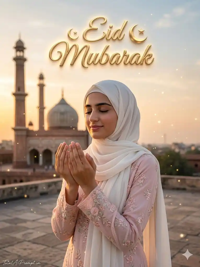 Generate an ultra-realistic, cinematic Islamic Eid portrait based on the provided reference image, ensuring the subject’s face matches the uploaded photo exactly with zero modification, preserving true facial identity, structure, proportions, expression, and skin tone while rendering natural skin texture, pores, and lifelike photographic realism. The composition should feature a beautiful young Muslim woman wearing a soft white hijab and a light pastel pink dress decorated with delicate floral embroidery, standing peacefully on a rooftop during golden-hour sunset, gently making dua with both hands raised and eyes softly closed, expressing calm devotion with a serene smile. In the background, include a majestic mosque with tall minarets and a large central dome, slightly blurred through shallow depth of field to maintain subject focus. The sky should display warm sunset tones such as soft peach, golden light, and pastel hues, with cinematic natural lighting casting a soft glow on her face, creating a tranquil spiritual atmosphere. Add subtle floating Islamic light particles or soft sparkling highlights around the subject for a dreamy festive effect. In the upper sky portion of the frame, place large luxurious 3D golden text reading “Eid Mubarak”, slightly curved and softly glowing, designed with embossed metallic gold lettering, gentle shine, soft shadow, and warm halo lighting, while integrating small crescent moon and tiny star elements into the typography for a premium festive design. Ensure professional photography quality with ultra-high detail, crisp focus, realistic textures, soft shadows, and cinematic depth, while maintaining a refined and natural color balance. Add a small, thin handwritten cursive signature “TotalAiPrompt.in” in white or soft off-white color at the bottom-left corner, subtle and elegant. Apply strict realism safeguards including no facial distortion, no identity alteration, no extra fingers or limbs, no warped anatomy, no plastic or over-smoothed skin, no blur, no noise artifacts, no cartoon/anime style, no duplicate features, no unrealistic lighting, and no background glitches. Render the final image in Ultra HD 4K with cinematic clarity, maintaining a vertical 3:4 aspect ratio for the final composition.