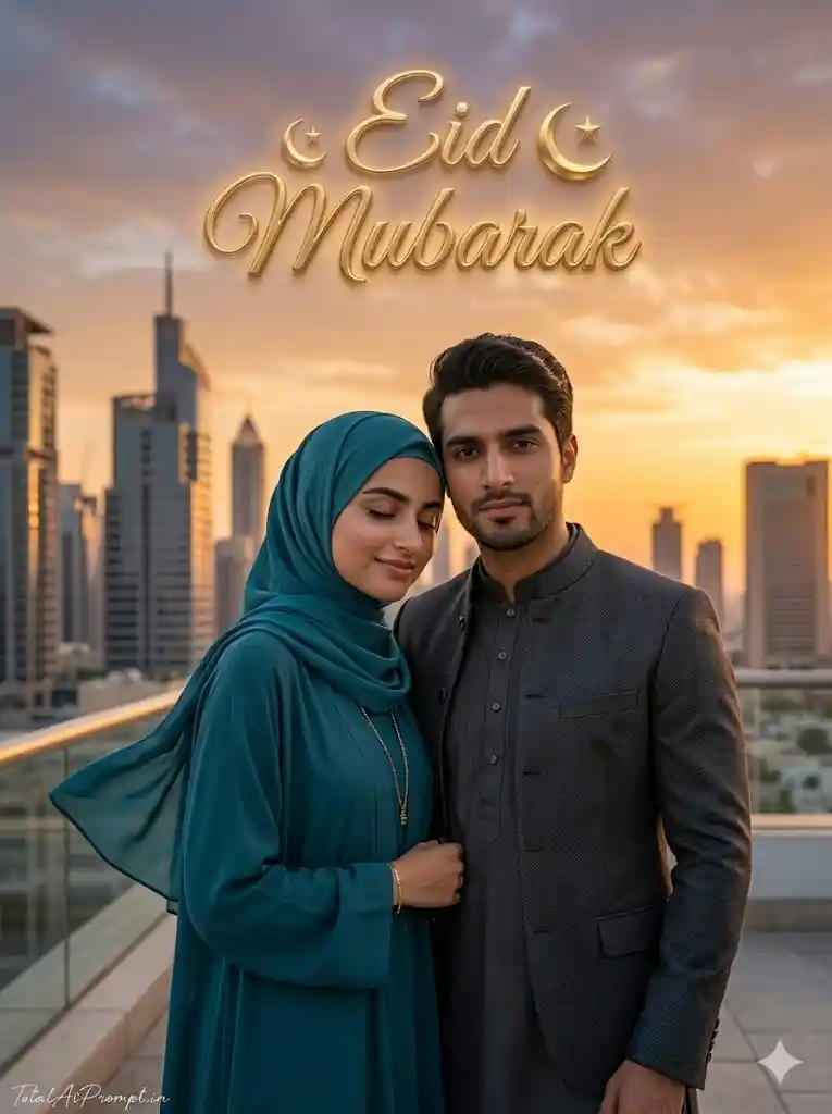 Create an ultra-realistic cinematic Eid portrait using the provided reference image, ensuring the face of the subject matches the uploaded photo perfectly with zero modification, preserving the exact facial identity, proportions, expression, and natural skin tone while maintaining authentic skin texture and photorealistic detail. The composition features a stylish Muslim couple standing confidently in a modern urban setting with a contemporary city skyline in the background during sunset; the husband wears a charcoal grey kurta layered with a sleek modern jacket, standing upright with a calm, loving expression, while the wife stands close beside him wearing a refined teal hijab and an elegant matching abaya with minimal jewelry, projecting warmth and confidence as both face the camera directly. The sky behind them displays rich sunset colors blending orange, amber, and soft purple hues, enhancing their natural Indian skin glow, while dramatic cinematic lighting highlights detailed facial textures and crisp skin clarity, with soft wind gently moving the hijab to add realism and graceful motion. The atmosphere should convey modern cultural fashion and urban luxury, captured in professional photography style with shallow depth of field, realistic textures, precise focus, cinematic color grading, and ultra-high clarity. Above the skyline in the sky area, include large elegant 3D text reading “Eid Mubarak” designed in premium modern Islamic calligraphy, rendered with soft metallic golden depth, subtle glowing edges, and natural shadows, blending harmoniously with the sunset colors while maintaining balanced composition without overpowering the couple. Strictly preserve the exact facial features from the reference image without beautifying, reshaping, altering, or modifying the face in any way, ensuring full identity accuracy. Place a small, thin handwritten cursive signature “TotalAiPrompt.in” at the bottom-left corner in white or soft off-white color, subtle and refined. Enforce realism safeguards including no facial distortion, no identity changes, no extra limbs or fingers, no warped anatomy, no plastic or overly smooth skin, no blur, no noise artifacts, no cartoon or anime style, no duplicate features, no unrealistic lighting, and no background glitches. Render with ultra-detailed realism, cinematic lighting, soft shadows, and natural depth, maintaining a vertical 3:4 aspect ratio for the final image.
