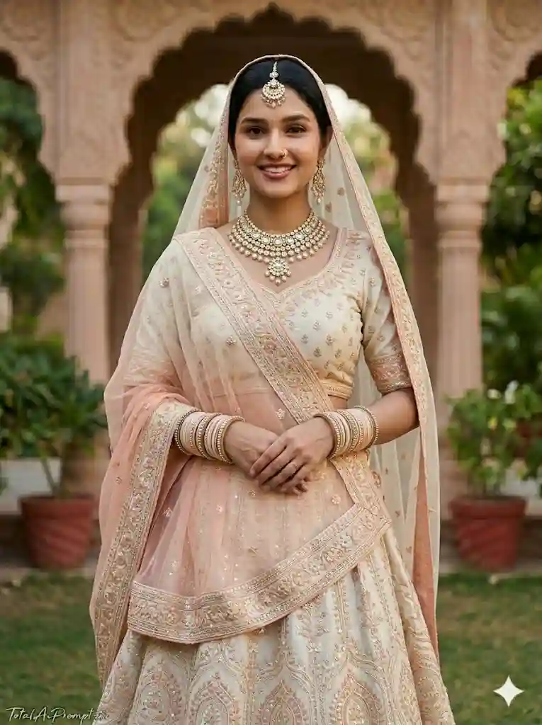Produce an ultra-realistic, cinematic DSLR full-body portrait of the same woman from the reference image with perfect identity retention and uncompromising face lock—her face must remain exactly identical in every detail, including structure, proportions, skin texture, expression, and makeup, with zero alteration or enhancement; preserve her natural calm smile and authentic appearance. She stands in the same front-facing pose with hands folded, wearing a newly designed Rajasthani lehenga in elegant ivory and pastel peach tones, adorned with fine threadwork embroidery, delicate sequin accents, and a refined wide border, paired with a softly flowing dupatta in a complementary gradient draped over her head and shoulder in a traditional style; include coordinated traditional jewelry such as bangles, a graceful necklace, and a maang tikka, all rendered with lifelike material detail. Ensure natural, true-to-life lighting with soft shadows, accurate skin tones, and highly detailed fabric textures, captured with a premium DSLR aesthetic featuring cinematic depth of field, crisp focus, and realistic color grading without any artificial or overprocessed look. The background should be naturally integrated and subtly blurred to enhance depth while keeping the subject prominent. Maintain a strict vertical 3:4 aspect ratio. Place the text “TotalAiPrompt.in” in the bottom-left corner in a small, thin handwritten cursive font, in white or soft off-white, giving a subtle premium feel. Negative prompts and constraints: no facial modification, no beautification or smoothing filters, no pose change, no outfit inconsistency, no anatomical distortions (extra or missing limbs), no asymmetry errors, no blur or pixelation, no overexposure or underexposure, no unnatural lighting or colors, no CGI or plastic-like rendering, no warped or unrealistic background, no duplicate subjects, and no additional text or watermark beyond the specified signature.