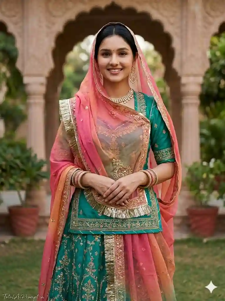 Create an ultra-photorealistic, high-end cinematic DSLR full-body portrait of the same woman from the reference image with uncompromising identity accuracy and absolute face consistency—her face must remain perfectly unchanged in every aspect, including bone structure, skin texture, expression, makeup, and overall appearance, with zero modification or enhancement; she retains the same gentle smile and composed demeanor while standing in the identical front-facing pose with hands folded. She is dressed in the exact same teal-green Rajasthani lehenga featuring finely detailed embroidery and a broad ornamental border, paired with the same pink-to-orange gradient dupatta gracefully covering her head and shoulder, along with identical traditional jewelry including bangles, necklace, and maang tikka. The scene should be rendered with natural, lifelike lighting, realistic shadows, accurate skin tones, and true fabric detailing, achieving a premium DSLR look with cinematic depth of field and precise sharpness, avoiding any artificial or overprocessed effects. The background must appear authentic and naturally integrated, enhancing realism without distraction. Maintain a strict vertical 3:4 aspect ratio. Include the text “TotalAiPrompt.in” in the bottom-left corner in a subtle, thin handwritten cursive font, in soft white or off-white for a refined, elegant finish. Negative prompts and constraints: no facial alteration, no beautification or smoothing filters, no change in pose, clothing, or accessories, no distortions, no extra or missing limbs, no asymmetry, no blur or noise, no unrealistic lighting or colors, no CGI or cartoonish rendering, no warped background, no duplicate subjects, and no additional text or watermark beyond the specified signature.