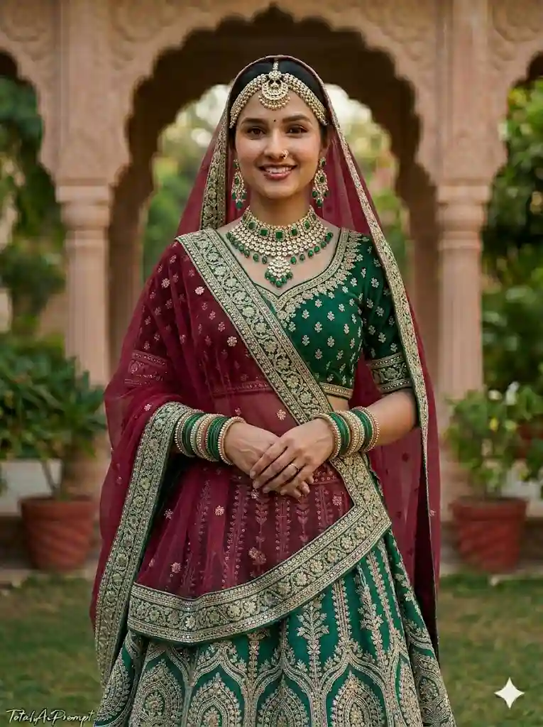Create an ultra-photorealistic cinematic DSLR full-body portrait of the same woman from the reference image with absolute identity fidelity and uncompromising face lock—her face must remain perfectly identical in every detail, including structure, proportions, skin texture, expression, and makeup, with zero modification, smoothing, or enhancement; preserve her natural calm smile and authentic look. She stands in the same front-facing pose with hands folded, wearing a newly designed Rajasthani lehenga in rich emerald green and antique gold tones, featuring intricate hand embroidery, fine zari detailing, and a heavy ornamental border, paired with a contrasting deep wine-red dupatta gracefully draped over her head and shoulder in traditional style; include coordinated traditional jewelry such as ornate bangles, a statement necklace, and a maang tikka, all rendered with lifelike metallic shine and precision. Ensure natural, lifelike lighting with soft realistic shadows, accurate skin tones, and highly detailed fabric textures, captured with a premium DSLR aesthetic, cinematic depth of field, crisp focus, and balanced, natural color grading without artificial enhancement. The background should appear realistic and seamlessly integrated, softly blurred to maintain focus on the subject. Maintain a strict vertical 3:4 aspect ratio. Place the text “TotalAiPrompt.in” in the bottom-left corner in a small, thin handwritten cursive font, in white or soft off-white, conveying subtle premium elegance. Negative prompts and restrictions: no face alteration, no beautification filters, no skin smoothing, no pose change, no outfit inconsistency, no anatomical distortions (extra or missing limbs), no asymmetry errors, no blur, no low resolution, no noise or pixelation, no overexposure or underexposure, no unnatural lighting or colors, no CGI or plastic-like rendering, no warped background, no duplicate subjects, and no additional text or watermark beyond the specified signature.