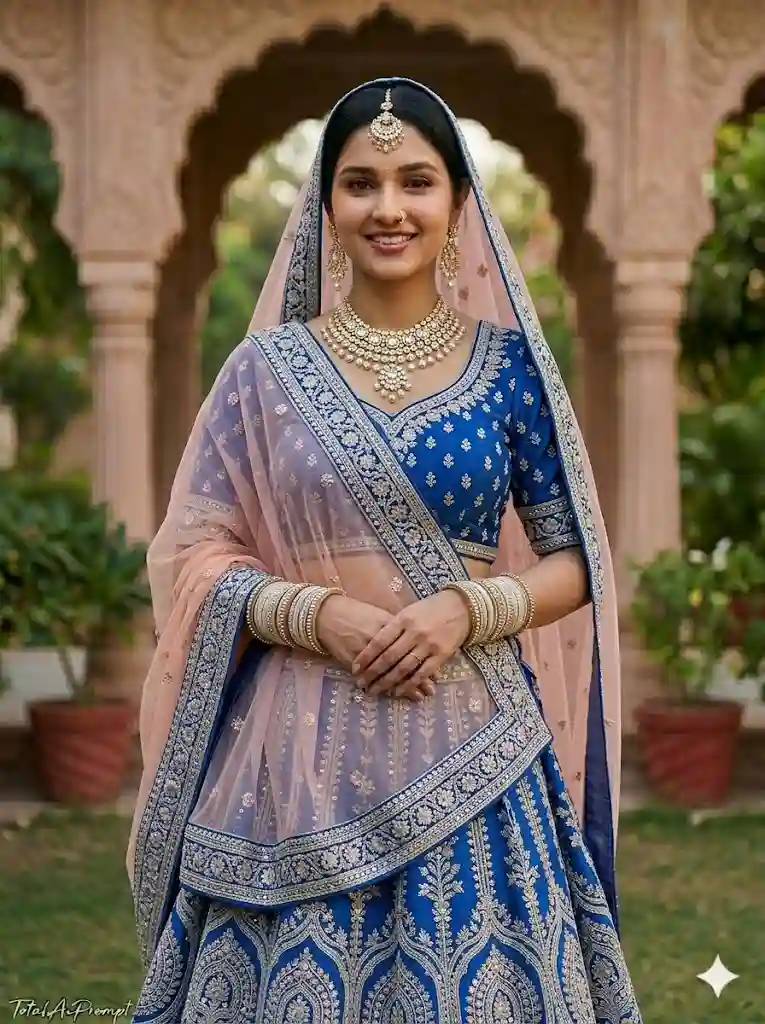 Generate an ultra-hyper-realistic cinematic DSLR full-body portrait of the same woman from the reference image with absolute identity preservation and flawless face lock—her face must remain 100% unchanged in every aspect, including bone structure, proportions, skin texture, expression, and makeup, with zero alteration, retouching, or enhancement; retain her natural calm smile and authentic presence. She stands in the same front-facing pose with hands folded, dressed in a newly styled royal blue Rajasthani lehenga featuring intricate silver thread embroidery, subtle mirror work, and an ornate broad border, paired with a contrasting soft blush-pink dupatta elegantly draped over her head and shoulder in traditional fashion; include matching traditional jewelry such as detailed bangles, an elegant necklace, and a maang tikka, all rendered with lifelike metallic reflections and fine detail. Ensure natural, realistic lighting with soft, balanced shadows, true-to-life skin tones, and highly detailed fabric textures, captured with a premium DSLR aesthetic, cinematic depth of field, precise sharpness, and natural color grading without any artificial or overprocessed appearance. The background should appear realistic and seamlessly blended, slightly defocused to enhance subject prominence. Maintain a strict vertical 3:4 aspect ratio. Add the text “TotalAiPrompt.in” in the bottom-left corner in a small, thin handwritten cursive font, in white or soft off-white for a subtle premium elegance. Negative prompts and constraints: no facial changes, no beautification filters, no smoothing or skin alteration, no pose variation, no outfit inconsistency, no anatomical errors (extra/missing limbs), no asymmetry, no blur, no noise or pixelation, no overexposure or underexposure, no unnatural lighting or colors, no CGI or plastic-like rendering, no warped or unrealistic background, no duplicate subjects, and no additional text or watermark beyond the specified signature.