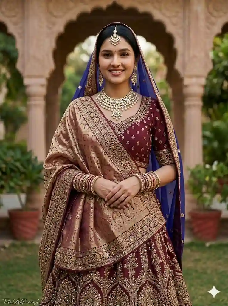 Ultra-photorealistic cinematic DSLR full-body portrait of the exact same woman from the provided reference image, with absolute identity preservation and strict face lock—no modification to facial structure, skin texture, expression, or makeup, ensuring 100% match with the original face, maintaining her calm smile and natural look; she stands in the same front-facing pose with hands gracefully folded in front. She is dressed in a redesigned, richly detailed Rajasthani lehenga in deep maroon and gold tones, featuring intricate zardozi-style embroidery, fine mirror work, and a heavy ornate border, paired with a complementary royal dupatta in a soft contrasting shade draped over her head and shoulder in traditional style; include elegant traditional jewelry such as matching bangles, a statement necklace, and a maang tikka, all rendered with realistic metallic shine and detail. The scene should exhibit lifelike lighting, natural shadows, accurate skin tones, and highly detailed fabric textures, captured as if with a high-end DSLR camera using cinematic depth of field, sharp focus, and balanced color grading without artificial enhancement. Background should be realistic and softly blended to enhance depth while keeping focus on the subject. Maintain a vertical 3:4 aspect ratio. Add the text “TotalAiPrompt.in” at the bottom-left corner in a small, thin handwritten cursive font, in white or soft off-white for a subtle premium feel. Negative prompts and restrictions: no face change, no retouching or beautification filters, no smoothing, no pose alteration, no anatomical errors (extra/missing limbs), no asymmetry, no blur, no low resolution, no over/underexposure, no unnatural lighting or colors, no CGI or plastic-like rendering, no background distortion, no duplicate subjects, and no additional text or watermark beyond the specified signature.